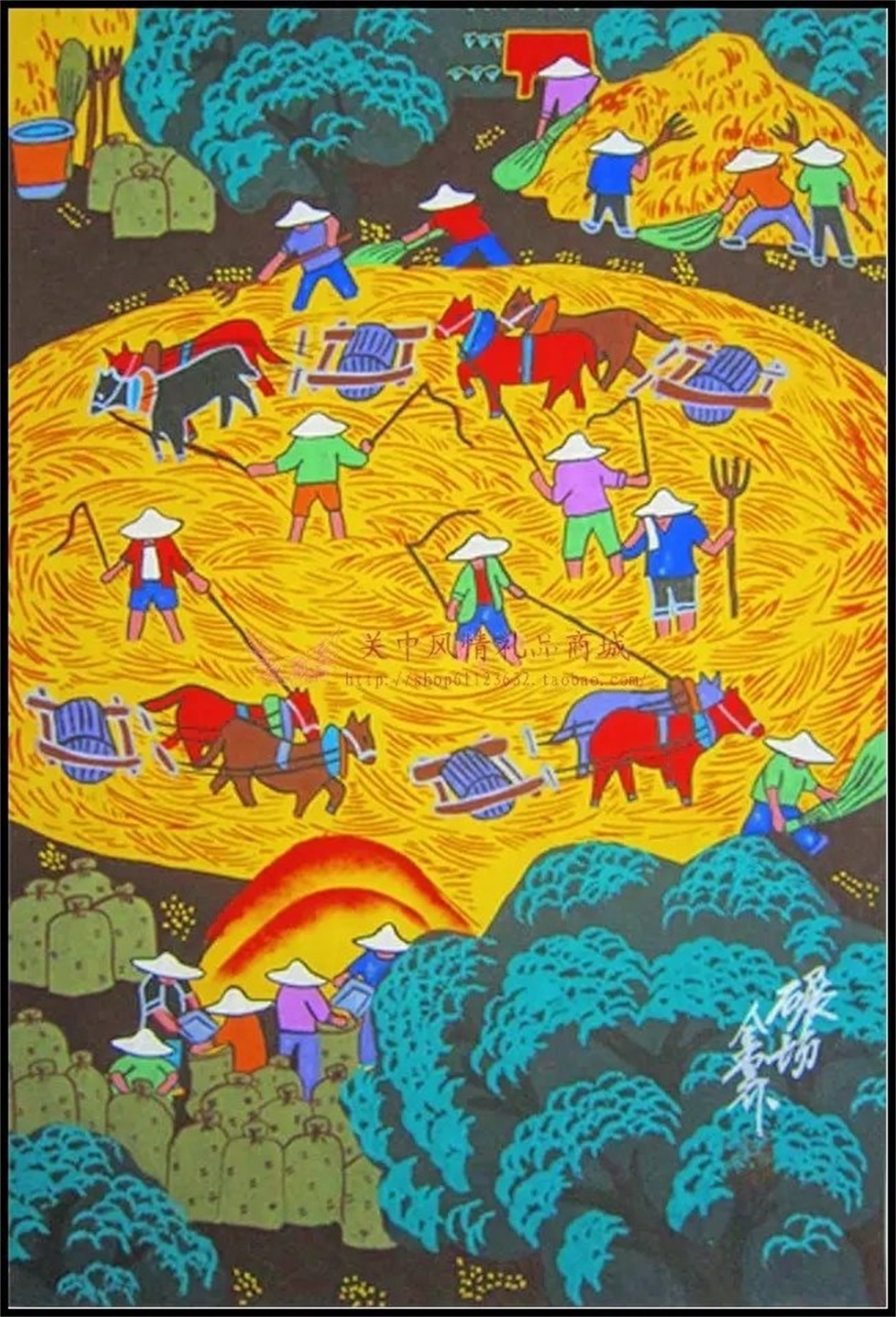 麦子经过了一个上午的暴晒,浑身的潮气已经蒸发得无影无踪,用手轻轻一揉便会迸出圆鼓鼓的麦粒来,咬一颗在嘴里,“嘎嘣”作响,清幽的麦香便会顺着食道浸入人的五脏六腑。“开始碾场!”郭大成下了命令。这时,青壮年便到饲养院牵来早已喂得草足水饱的牛马骡驴们,驾上头牯家伙,拉着放在打麦场边上的碌碡就上场了。碾场把式们头戴草帽,各自为中心,一手抓缰绳拽着转圈的牲口,一手拿鞭子,口中不停地吆喝,手上甩着响鞭,那牲口们便浩浩荡荡地在铺满麦子的大场里转圈碾压。刚开始的时候,牲口们显得很吃力,随着碌碡一遍遍循环往复,麦秸全部碾倒了,像地毯一样平展,这时,碾场把式扬起鞭子,“嘚儿——驾!”大喊一声,牲口们耳朵一竖,便四蹄撒开一溜小跑,那石碌碡“咕噜咕噜、吱吱呀呀”,欢快地飞转,那碾压的麦子,就像展开的扇面十分漂亮……
