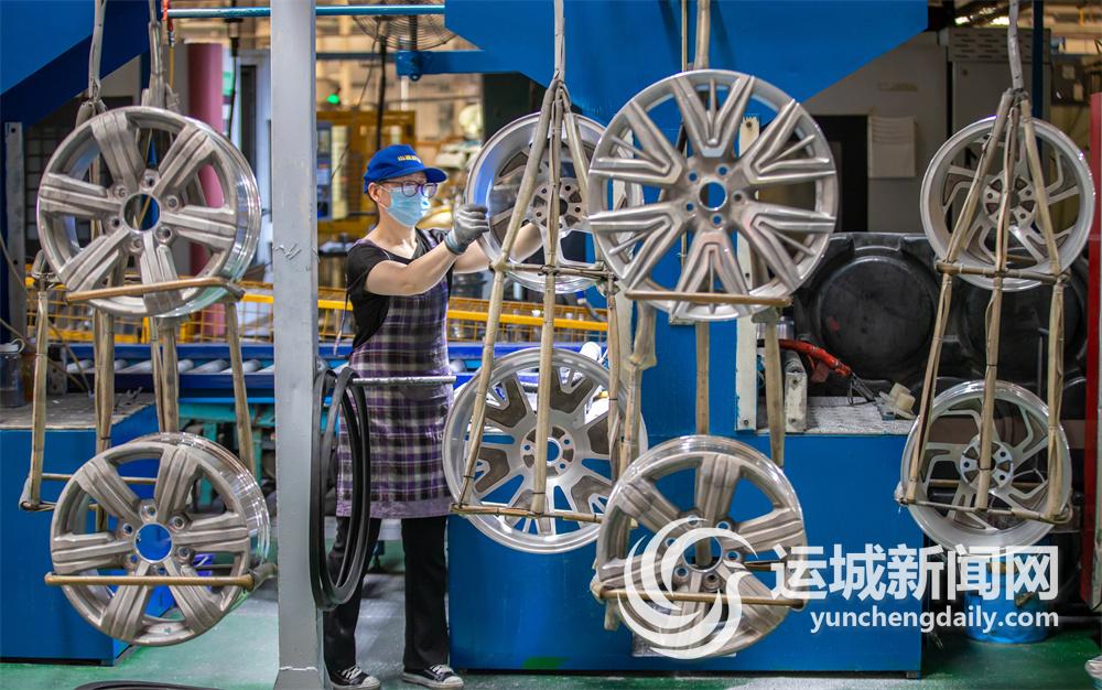 6月8日,在山西同誉金属材料科技有限公司,工人忙着加工铝合金汽车轮毂。