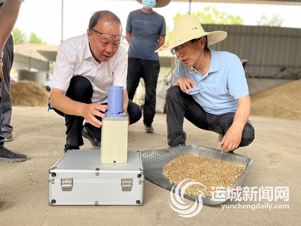 当天,来自国家小麦产业技术体系、山西省农技推广中心、山西农大小麦研究所和棉花研究所、市农业农村局等单位的10位技术专家,依照农业农村部粮食高产创建测产验收办法的规定,在山西云丰种业位于永济市西伍姓村的优种繁育田里,随机实打实收5.15亩小麦,经过丈量面积、查验清仓、校正计量器具、测定含水量、称重、去杂、计算产量等步骤,折合标准籽粒含水量13%后,确定平均亩产826.6公斤,刷新了我市水地小麦高产纪录。