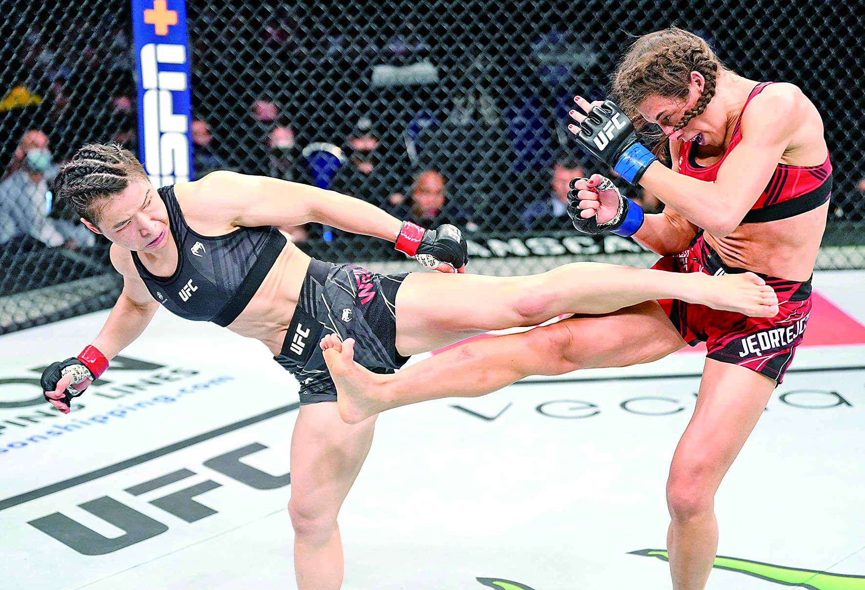 ▲6月12日,张伟丽(左)和乔安娜·耶德尔泽西克在比赛中。当日,在新加坡举行的终极格斗冠军赛(UFC)275中,亚洲首位终极格斗冠军赛(UFC)世界冠军张伟丽KO(击倒)波兰选手乔安娜·耶德尔泽西克,赢得女子草量级冠军挑战权。 新华社发(UFC 供图)