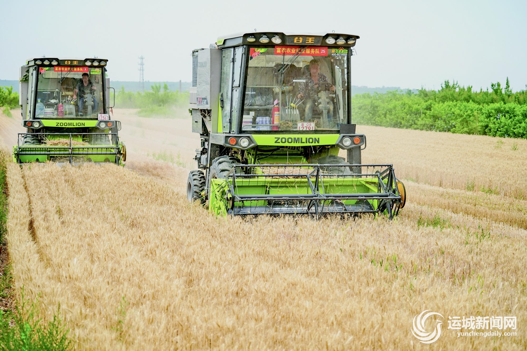 万荣县皇甫乡东埝村富农农机服务专业合作社的两台联合收割机正在收割小麦。 记者 陈方斌 摄