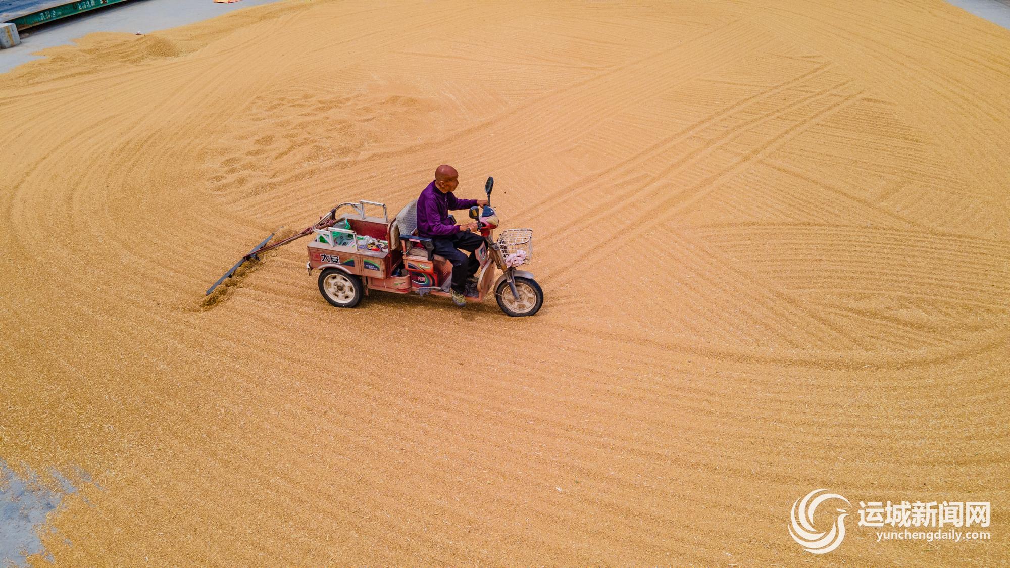 走进万荣县荣河中里庄七彩家庭农场的大门,一个占地4亩大的宽敞晾晒场让人眼前一亮。晾晒场上,当天收割回来的麦子正在接受阳光浴,一名农场员工驾驶着一辆绑有耙子的电动三轮车在翻麦。