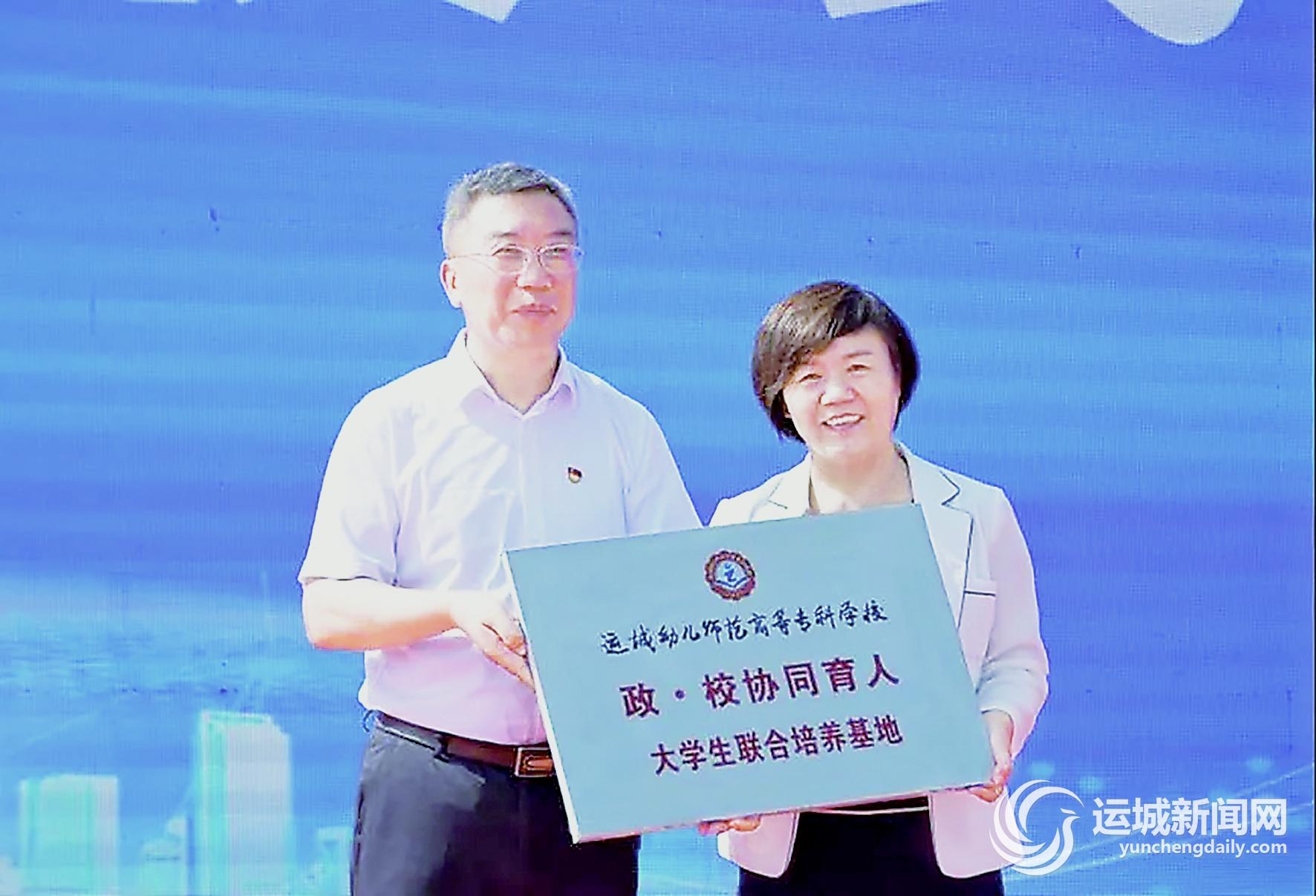 ▲运城幼儿师范高等专科学校党委书记常江雷为临猗县“省校合作大学生联合培养基地”授牌