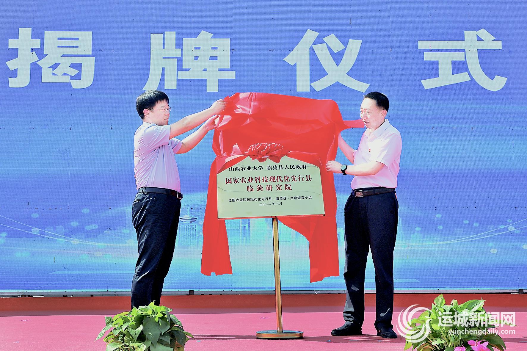 ▲山西农业大学副校长孔照胜和临猗县委书记于鹏飞共同为“国家农业科技现代化先行县临猗研究院”揭牌