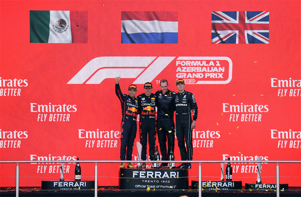 ▲6月12日,冠军红牛车队荷兰车手维斯塔潘(左二)、亚军红牛车队墨西哥车手佩雷兹(左一)、红牛车队车辆工程师汤姆·哈特(右二)和季军梅赛德斯车队英国车手拉塞尔在颁奖仪式上合影。 当日,在巴库进行的2022年世界一级方程式赛车锦标赛(F1)阿塞拜疆大奖赛正赛中,红牛车队荷兰车手维斯塔潘和墨西哥车手佩雷兹分获冠军和亚军,梅赛德斯车队英国车手拉塞尔获得季军。 新华社发(巴巴耶夫 摄)