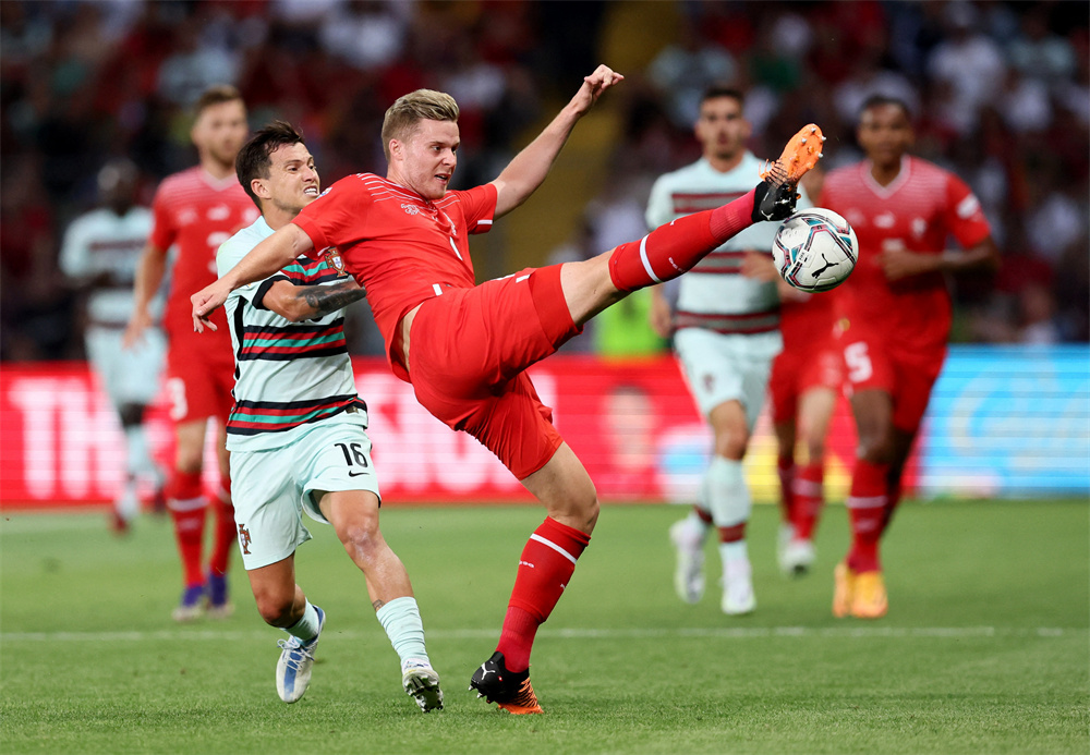 ▲6月12日,葡萄牙队球员奥塔维奥(前左)与瑞士队球员埃尔维迪拼抢。 当日,在瑞士朗西举行的欧洲国家足球联赛A级小组赛中,瑞士队主场以1比0战胜葡萄牙队。 新华社/路透