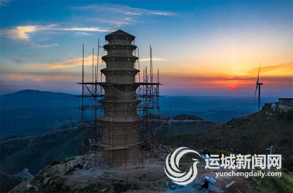 ▲6月13日傍晚,在万荣县稷王山拍摄的修缮中的全国重点文物保护单位稷王山塔。