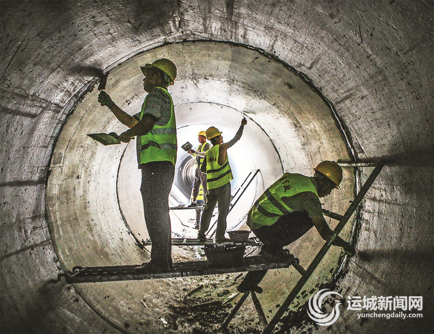 6月21日,万荣县宝鼎路防洪排水工地,工人们在对管道接口进行防水处理。 万荣县针对去年汛期县城暴露的问题和短板,加紧实施宝鼎路3.6公里防洪排水改造工程,确保防洪工程在汛前保质保量完成,进一步提升城市内涝防御能力。