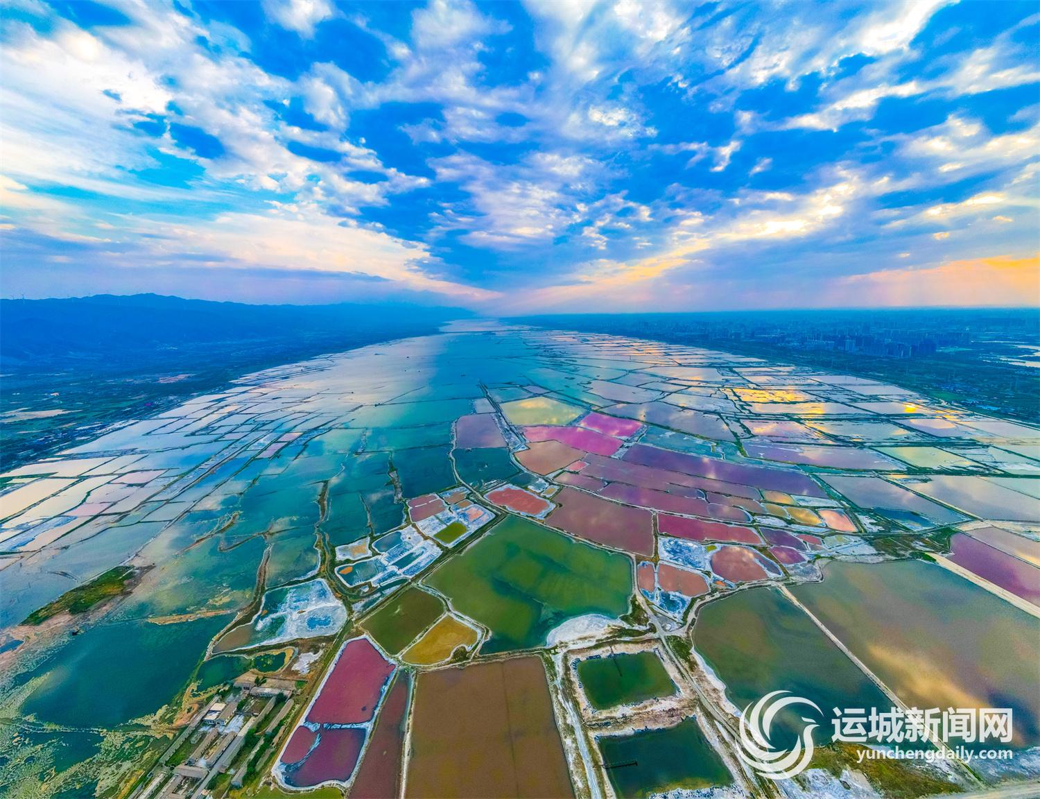 6月19日,空中俯瞰,盐湖宛如巨型调色板,色彩斑斓、美不胜收。 近年来,我市不断加大“退盐还湖”“还湖于民”生态修复力度,最大限度恢复盐湖原有生态系统和风貌,绘就山水相映、文旅相融的七彩盐湖。