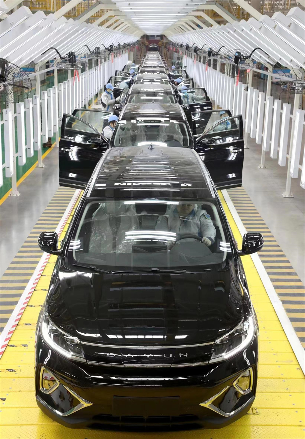 机械轰鸣、火花四溅……仲夏时节,走进大运汽车股份有限公司新能源汽车生产基地的焊装车间,200多台机器臂围着车体快速翻转,灵活作业。不少身着蓝色工服的工作人员正围在一起,对着眼前的机器臂不时讨论着。