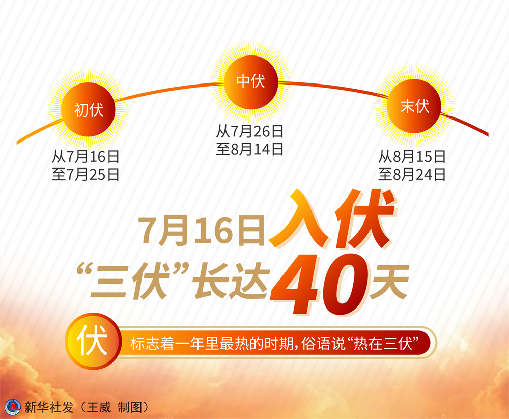 6月21日,夏至。夏至后不久,便是伏天,俗语说“夏至三庚便数伏”,这意思是说,从夏至日开始数起,数到第三个“庚日”就进入初伏,也就是入伏的首日。天文科普专家表示,今年从夏至日起后数到的第三个“庚日”是7月16日,意味着这一天是入伏的时间。 新华社发 王威 制图