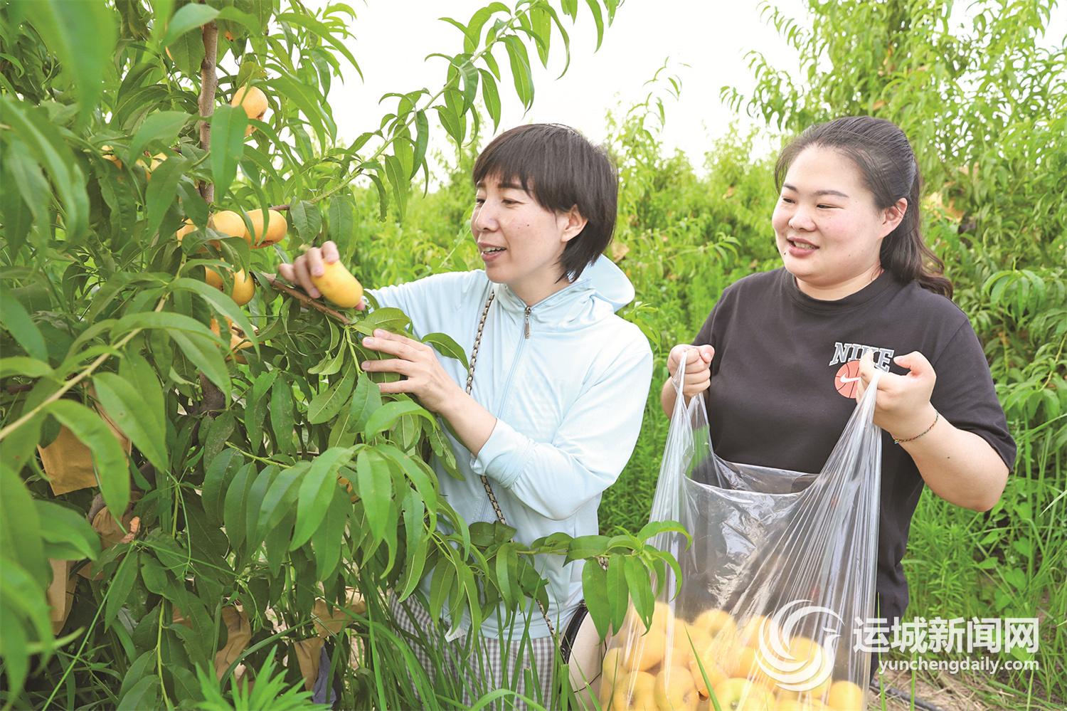 6月20日,河津市阳村街道连伯滩的桃园里,游客在采摘黄金油蟠桃。