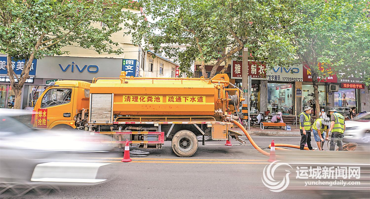 6月21日,在中心城区安邑西路与河东东街交叉口,排水车辆在进行排水抢修。