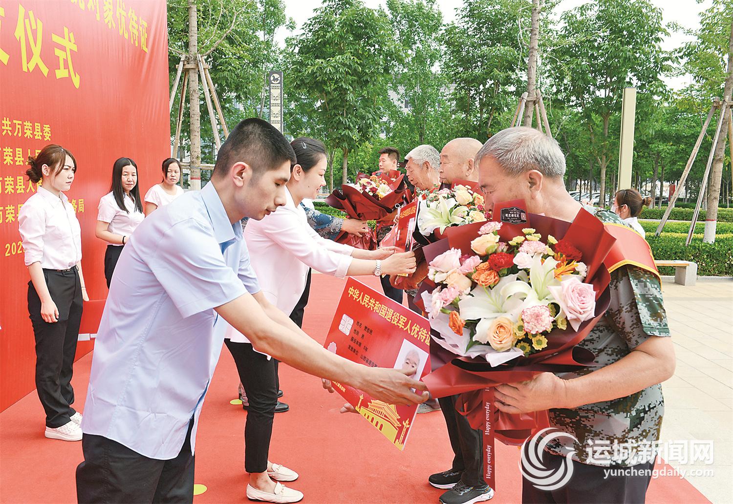 6月21日,万荣县举行退役军人及其他优抚对象优待证首发仪式。首批10名退役军人和其他优抚对象代表身披绶带、手捧鲜花,领到了专属于自己的优待证。