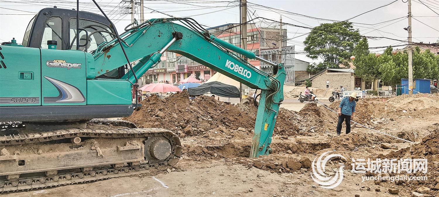 6月23日,夏县南大里乡街道提升改造施工现场,工人在进行雨污分流施工。