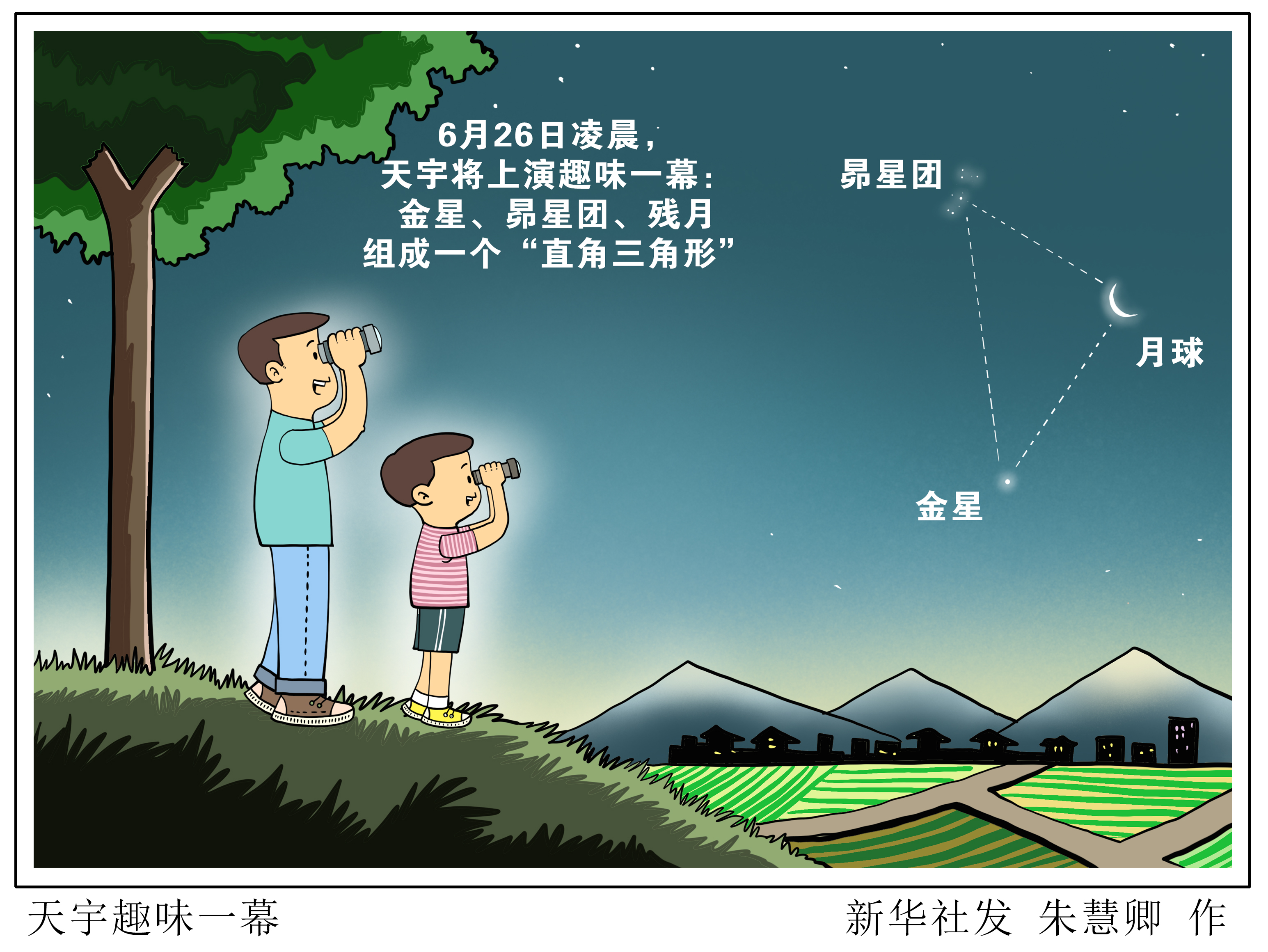6月26日凌晨,天宇将上演趣味一幕:金星、昴星团、残月组成一个“直角三角形”,届时只要天气晴好,大气透明度高,我国感兴趣的公众凭借肉眼就能看到这个天空中的“几何图形”。