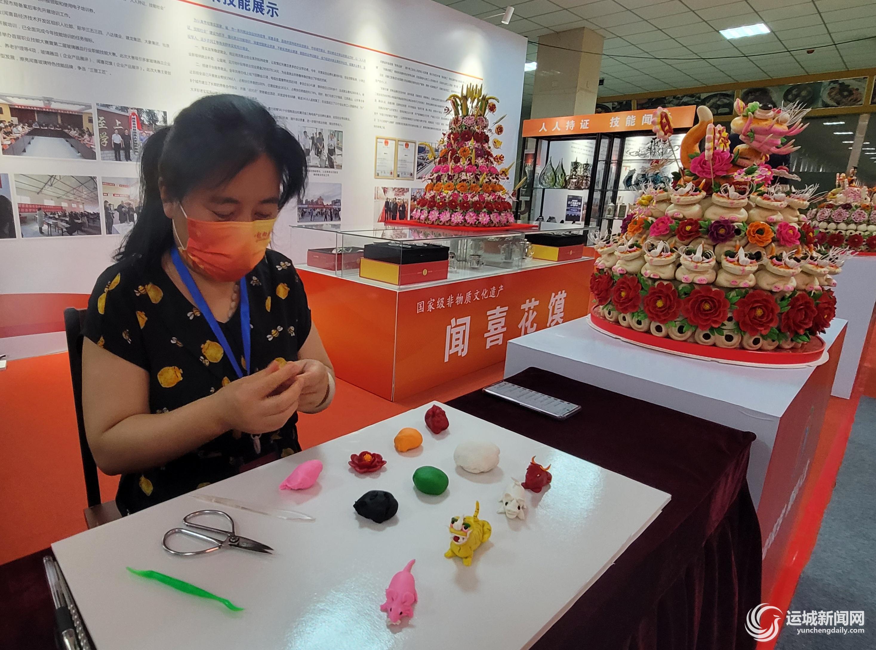 6月27日晚,记者在活动展厅看到,各县(市、区)的展台都经过了精心布置,亮点和特色明显,许多展品还包含有关公等运城元素。现场,既能看到扯面、拉面、饼子、油泼面等面食的制作过程,又能欣赏到令人惊叹的面食绝技绝活表演,以及精美绝伦的闻喜花馍、大型彩色面塑等。