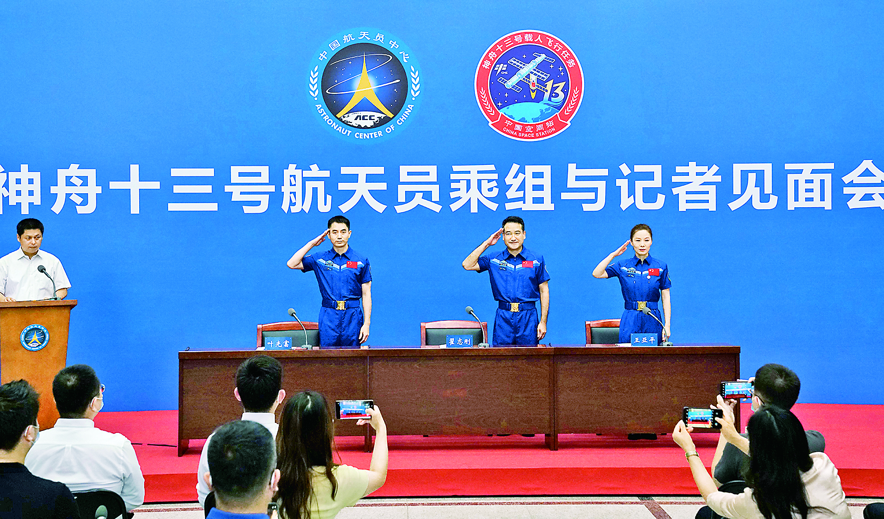 ▲6月28日,神舟十三号航天员叶光富(左二)、翟志刚(右二)、王亚平(右一)敬礼致意。
