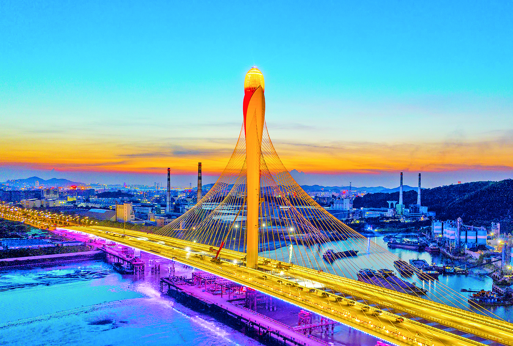 6月30日,由中铁大桥局承建的广东东莞滨海湾大桥正式通车。滨海湾大桥地处被定位为粤港澳大湾区协同发展特色平台的东莞滨海湾新区,以东莞市花玉兰花为创意元素,上跨磨碟河入海口,为独塔扭索面斜拉桥,全长973.6米。