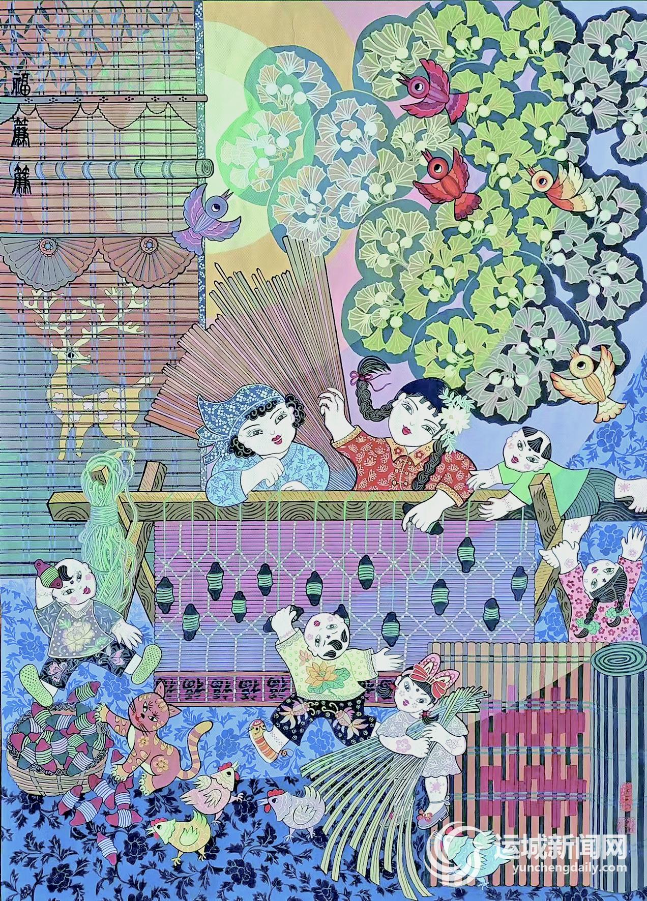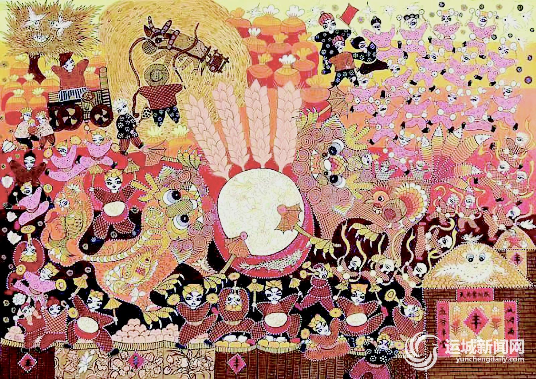 其中,山西省有6幅农民画优秀作品入展,运城市占3幅。这些作品分别是王淑红的《福帘帘》,李建肖的《庆丰收》,薛希玲的《美在丰收里》。