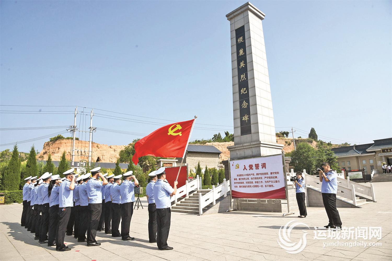 图为闻喜县交警大队全体党员在稷麓英烈纪念碑前重温入党誓词。