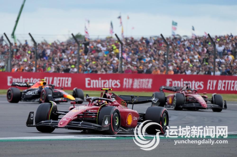 7月3日,法拉利车队西班牙车手塞恩斯(前)在比赛中。 当日,在英国银石赛道举行的世界一级方程式锦标赛(F1)英国大奖赛中,法拉利车队西班牙车手塞恩斯夺得生涯首个分站冠军。红牛车队墨西哥车手佩雷兹获得亚军,梅赛德斯车队英国车手汉密尔顿收获季军。