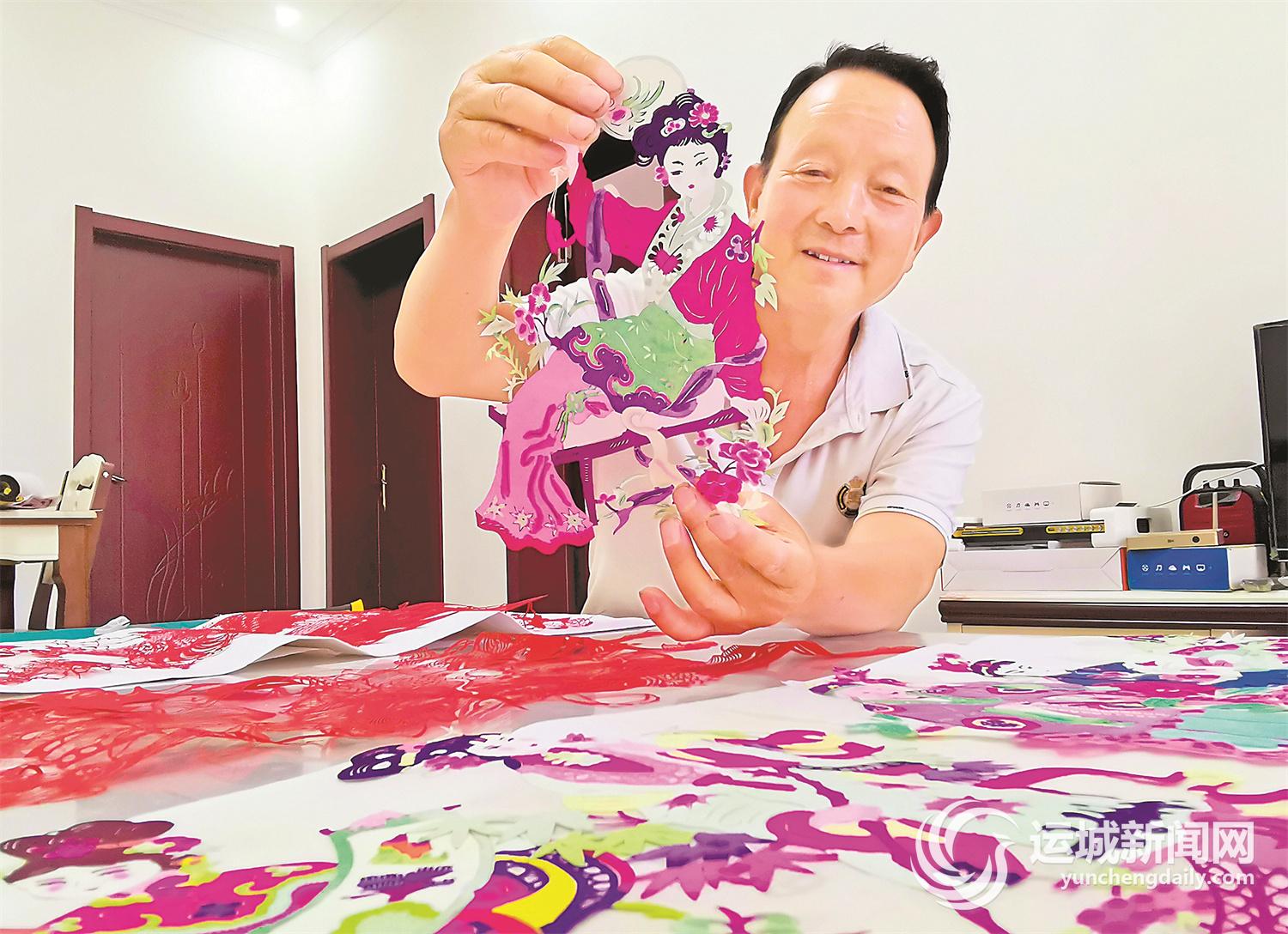 芮城县古魏镇庙底村农民苏世忠在展示自己的剪纸作品。 苏世忠从2000年学习叠色剪纸以来,先后创作出500余幅作品,作品画面鲜艳、立体、逼真,他也先后获得运城市图案剪贴比赛优胜奖、芮城县“文创助推文旅”大赛金奖等。