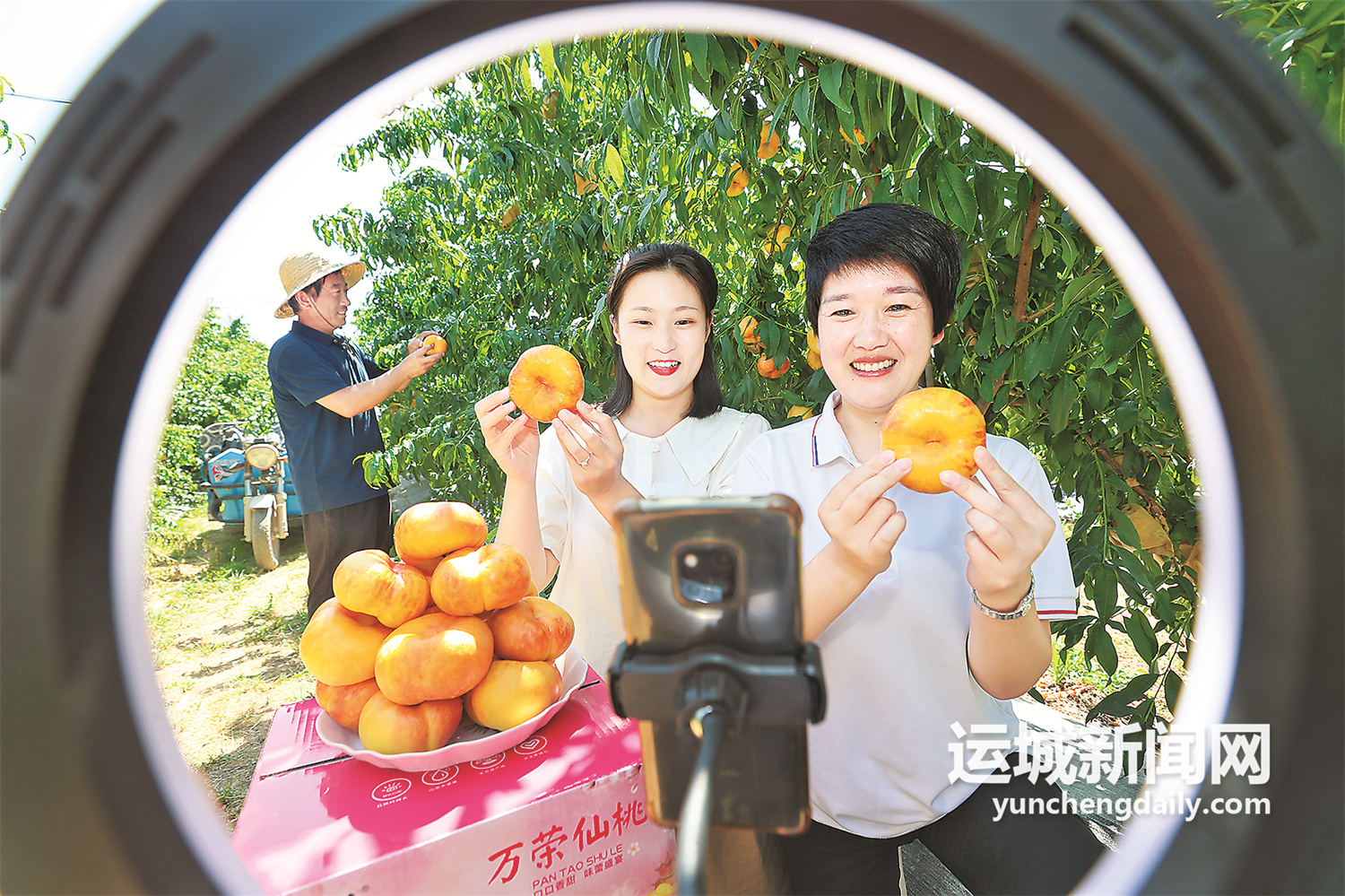 7月6日,万荣县汉薛镇南景村新品种桃示范基地,工作人员在对黄金蟠桃进行直播推介。