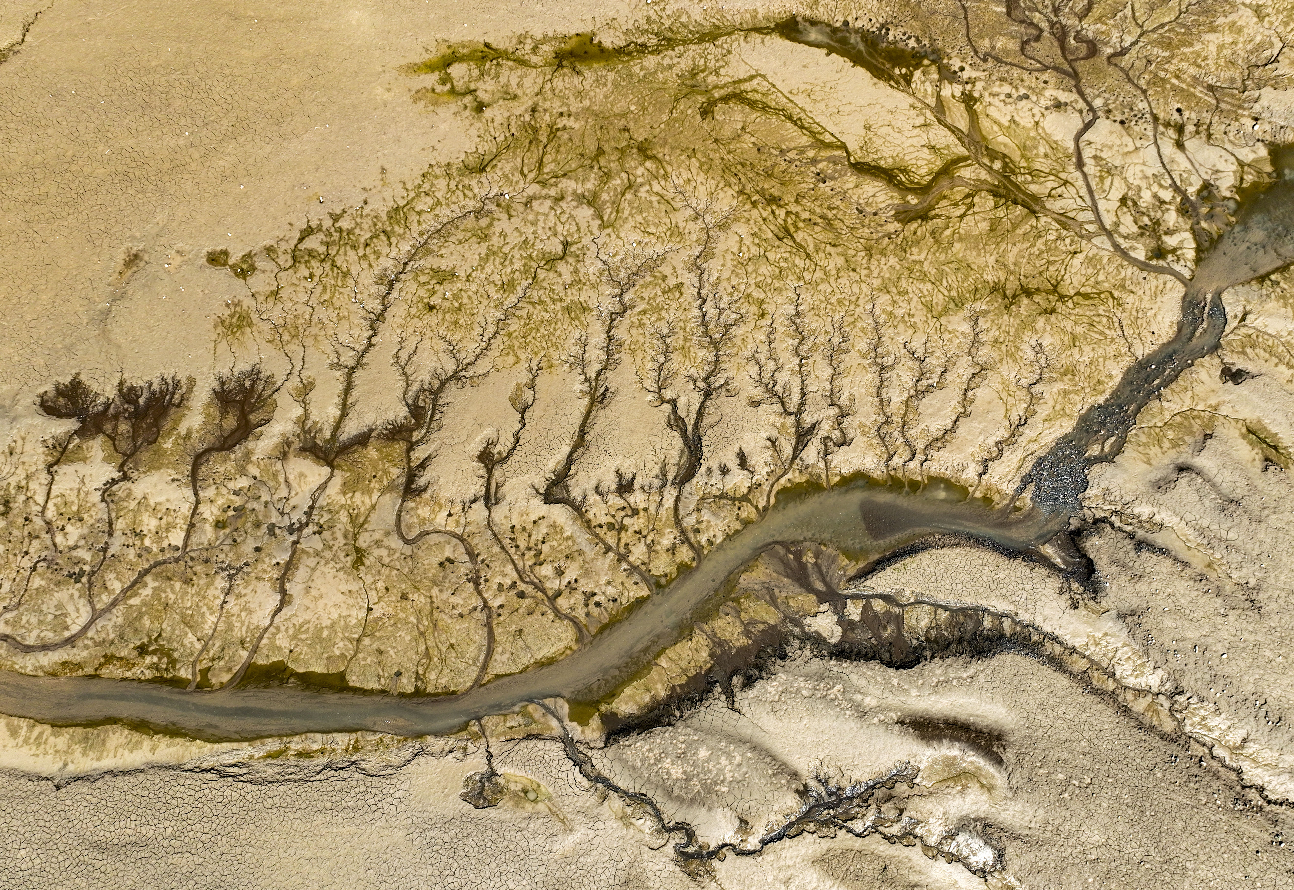 近日,随着黄河小浪底水利枢纽汛前调水调沙的结束,黄河小浪底库区水位下降,大面积河床裸露出水面,河水在河床上冲刷留下的痕迹形成黄河“沙画”。 新华社发(苗秋闹 摄)