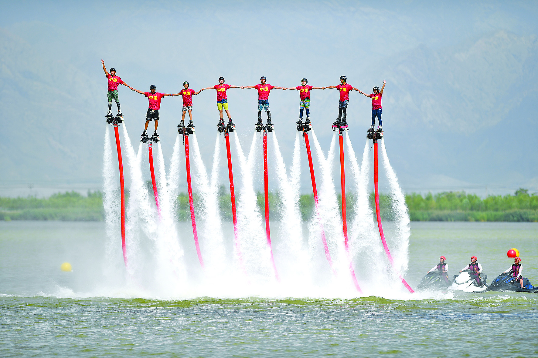 7月9日,参赛选手在2022年中国摩托艇联赛宁夏沙湖大奖赛开幕式上进行“水上飞人”表演。