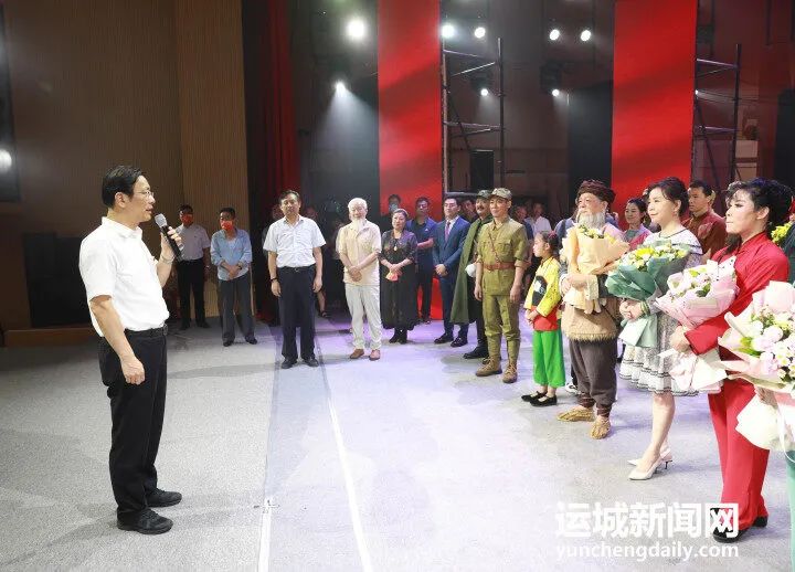 演出结束后,丁小强走上舞台同演职人员亲切握手交流,代表市委、市政府向所有演职人员的辛苦付出表示衷心感谢,并祝贺演出成功。丁小强希望山西省蒲剧艺术院和全体演职人员认真贯彻落实习近平总书记关于文艺工作的重要论述,坚持守正创新,结合党史学习教育常态化长效化,推出更多思想精深、艺术精湛、制作精良的佳作,让艺术真正走进群众、贴近群众,把更多优秀艺术作品送到群众身边去,让人民群众在欣赏优秀作品中与共产党心连得更紧、贴得更近,共同为实现中华民族伟大复兴的中国梦而努力奋斗。