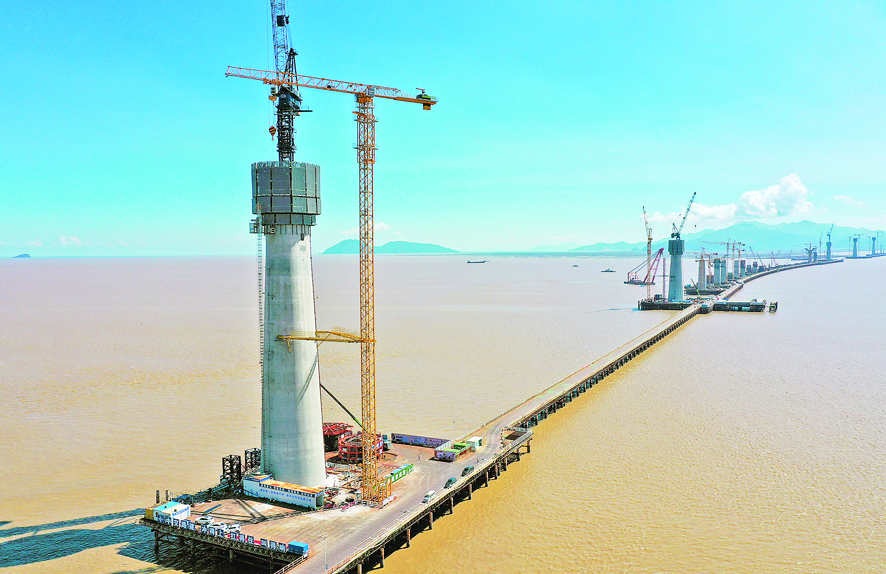 建设中的黄茅海跨海通道高栏港大桥东主塔(前)(无人机照片,7月12日摄)。