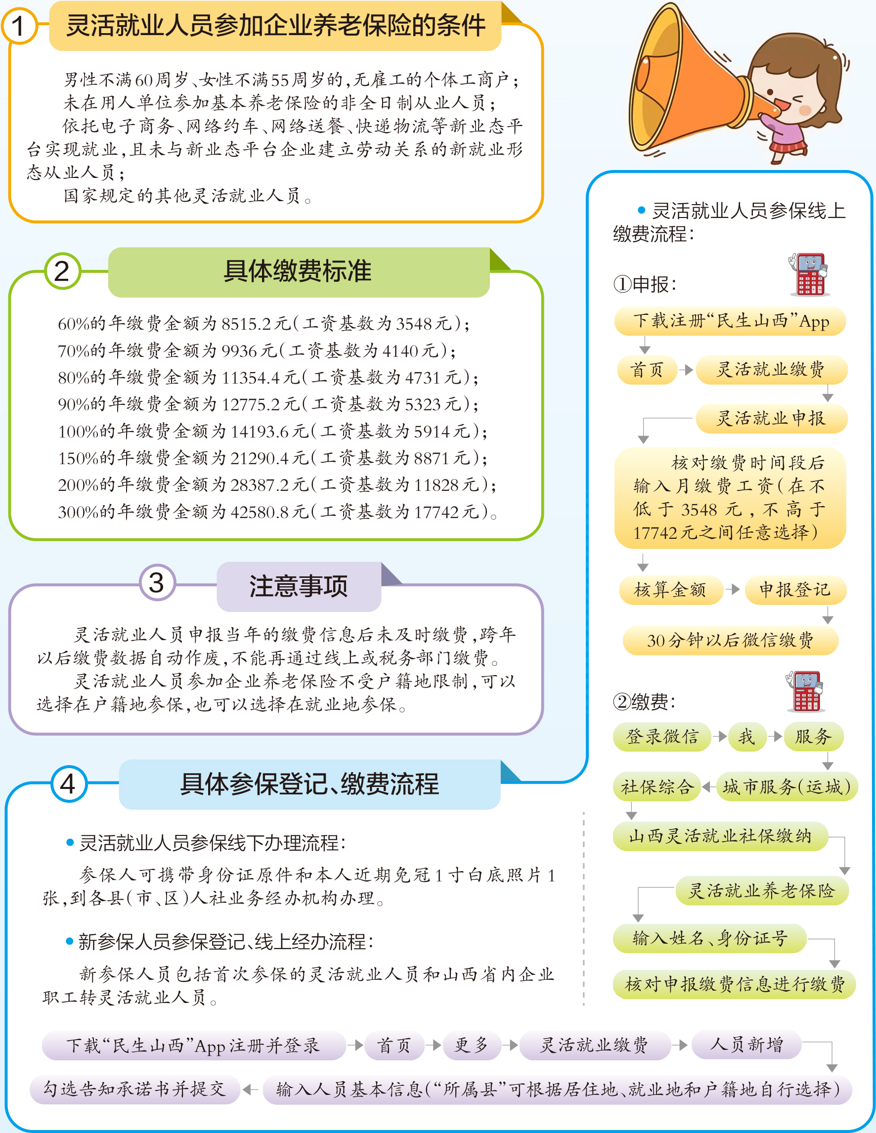 运城晚报讯(记者 范楚乔 郝丽莎)7月12日,从市社保中心获悉,我市灵活就业人员2022年度企业养老保险开始缴费。符合条件的人员,可于7月至12月每月1日至24日通过线上或线下方式申报缴费。