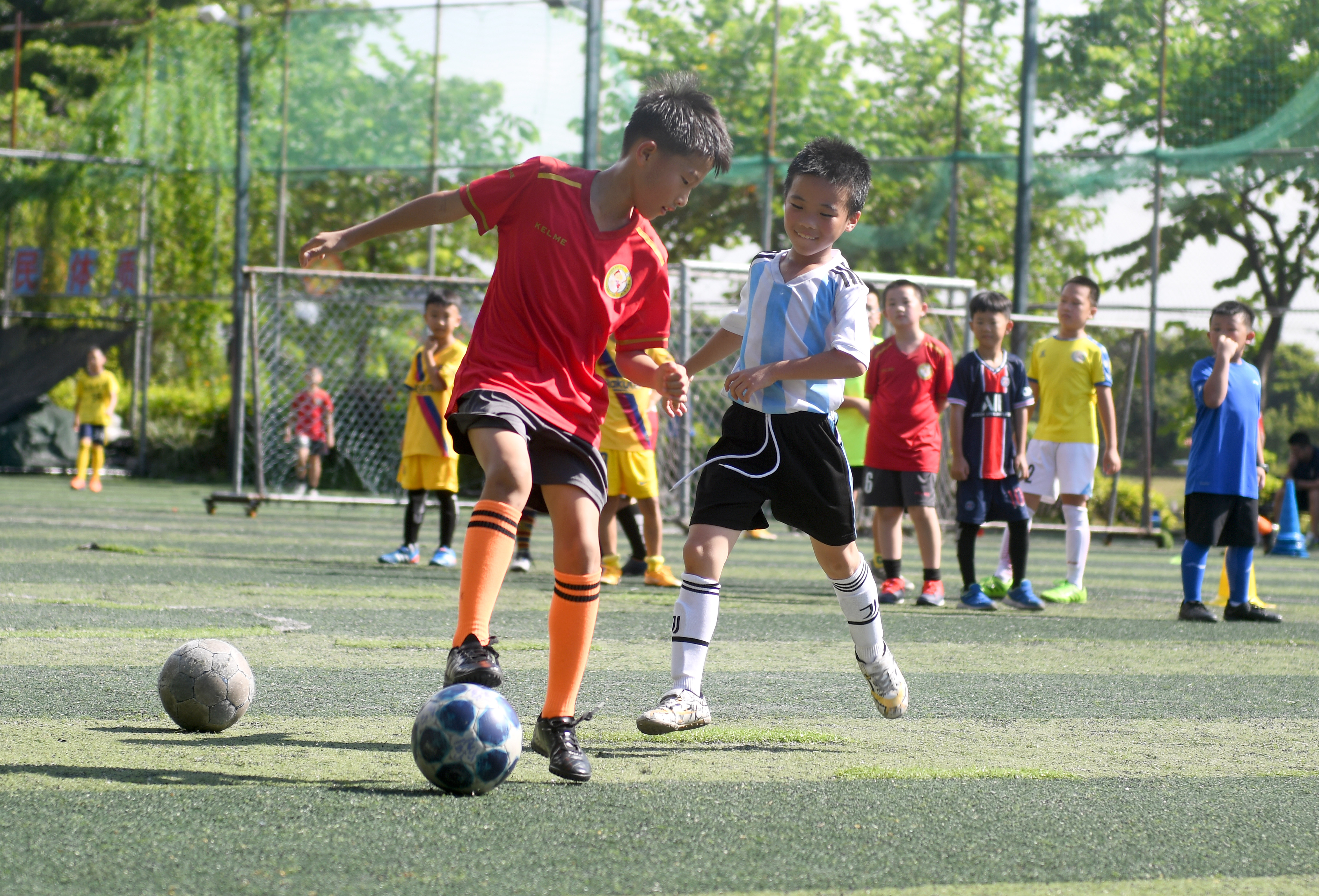 7月13日,在广州市的一个足球场内,孩子们在踢足球。
