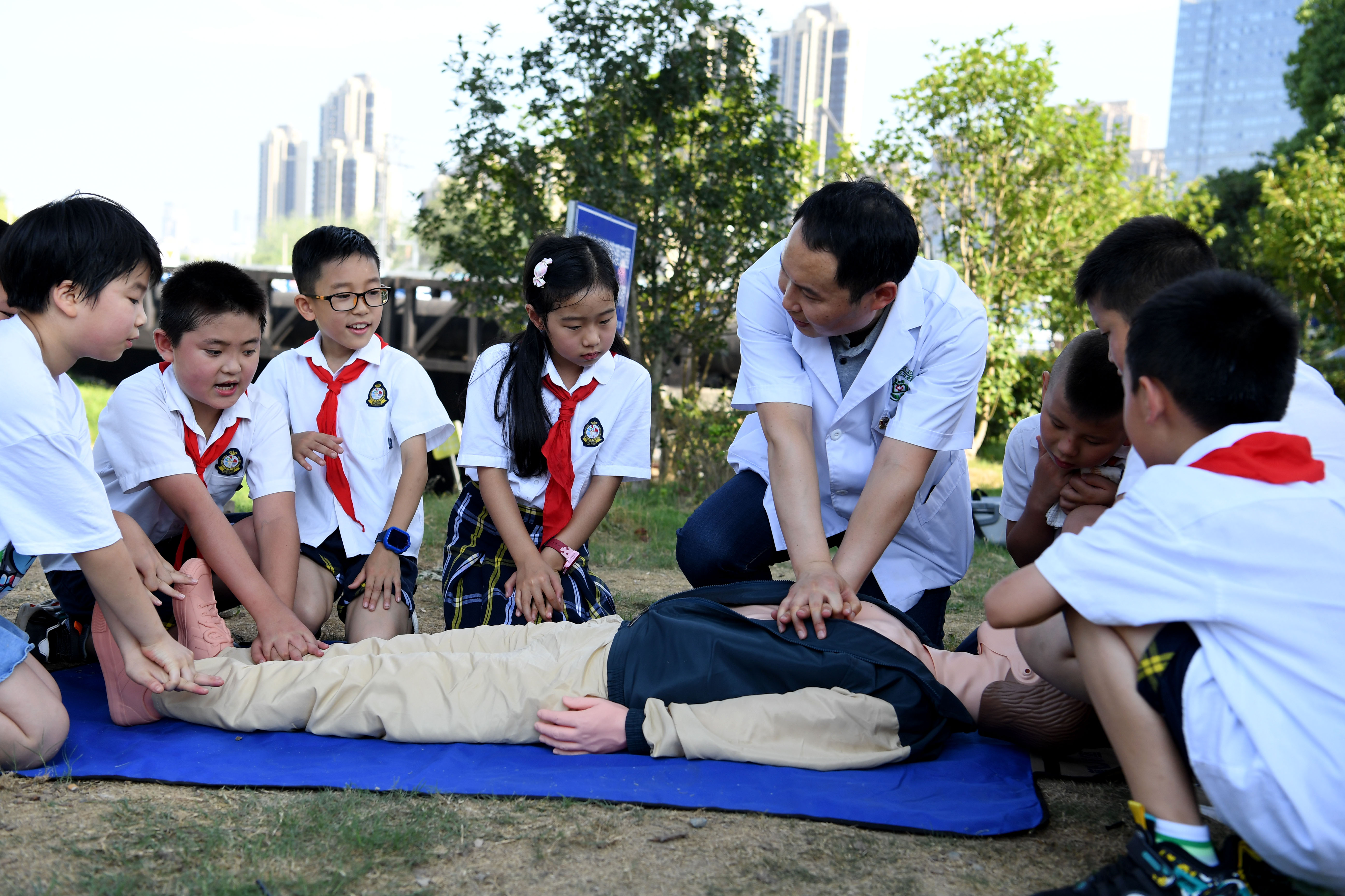 7月13日,合肥市包河区常青街道社区卫生服务中心医生指导小朋友学习急救知识。