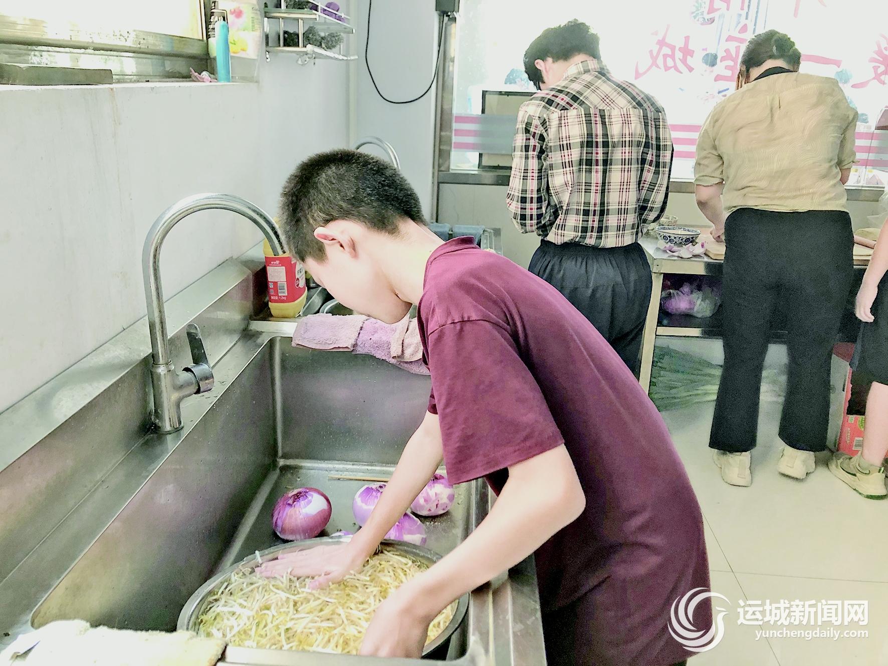 7月11日,推开位于市区棉北街与解放北路交叉口的“阳光之家”玻璃门,一股油香味和蒜香味扑面而来,原来是阳光少年与志愿者正在炸油饼、调凉菜,准备当天的午餐。而在此之前,他们在志愿者的指导下,刚刚结束了一上午的功课学习。