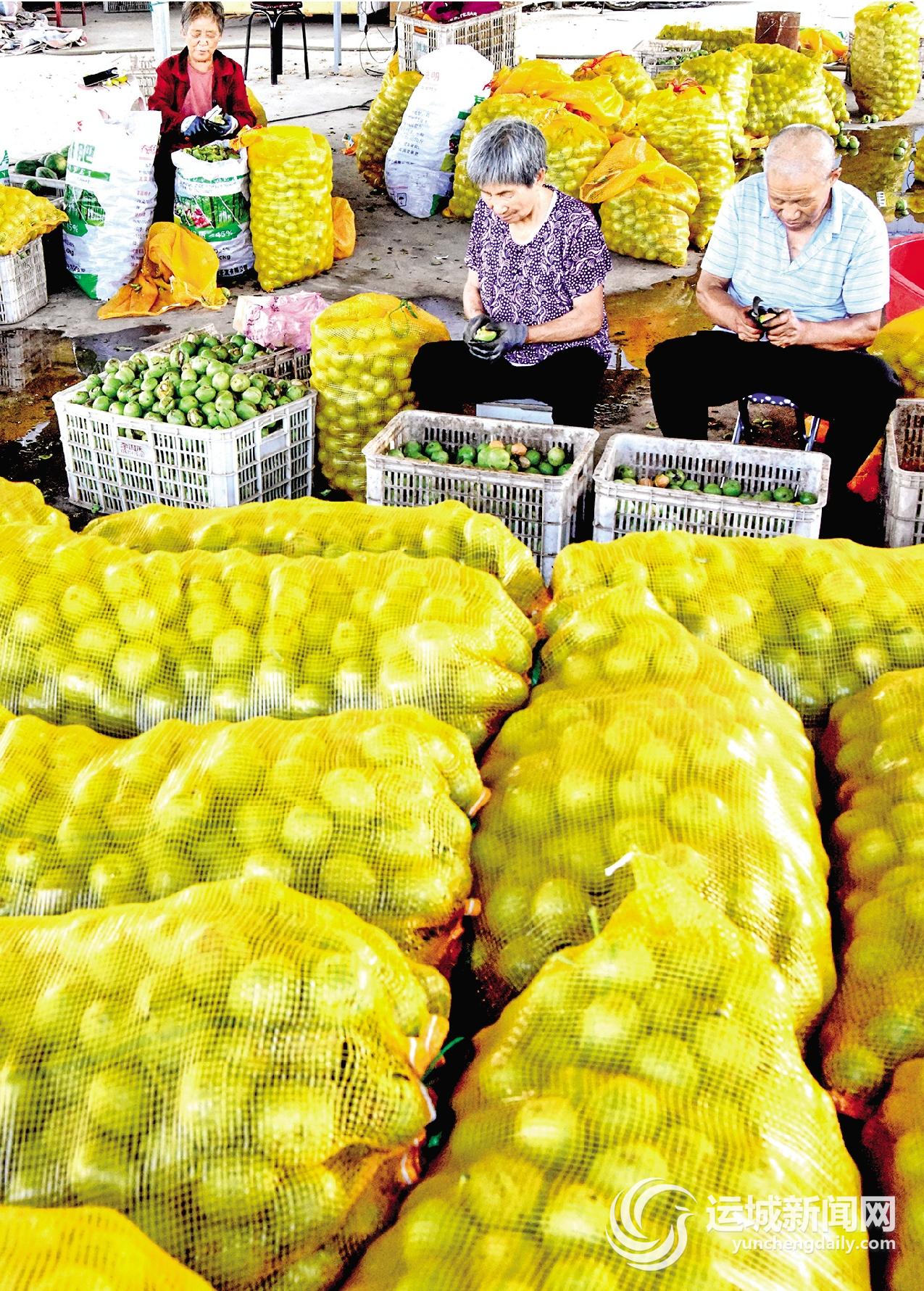 7月18日,在垣曲县保乐农业开发公司,员工对收购的新鲜青皮核桃进行去皮。