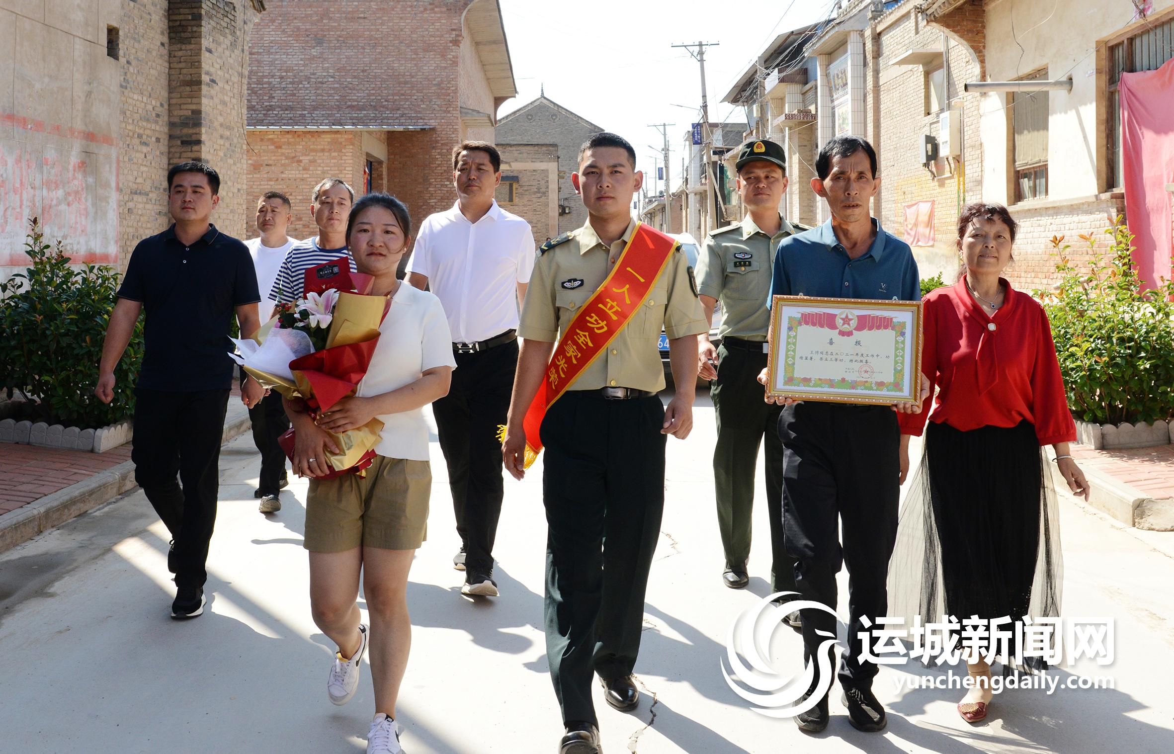 图为万荣县人武部和县退役军人事务局为在家休假的现役军人王博及家属送去立功喜报。 王成林 摄