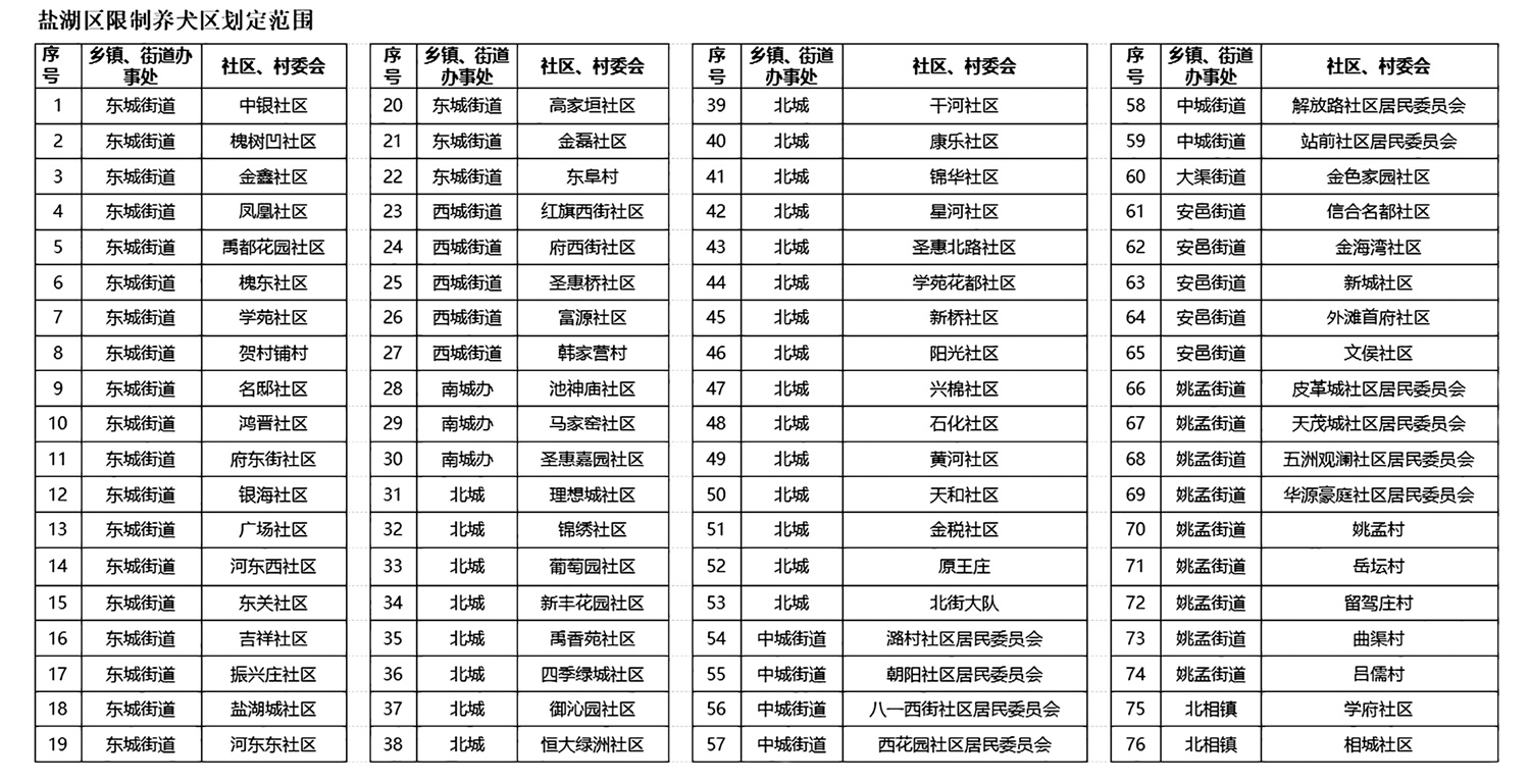 为加强中心城区养犬管理,维护市容环境和公共秩序,保障群众的人身健康安全,盐湖公安分局和各街道办事处,以及养犬管理工作领导小组,根据《规定》相关要求,并结合盐湖区实际,将中心城区中银社区、槐树凹社区、金鑫社区、凤凰社区等76个社区(村)确定为限制养犬区。