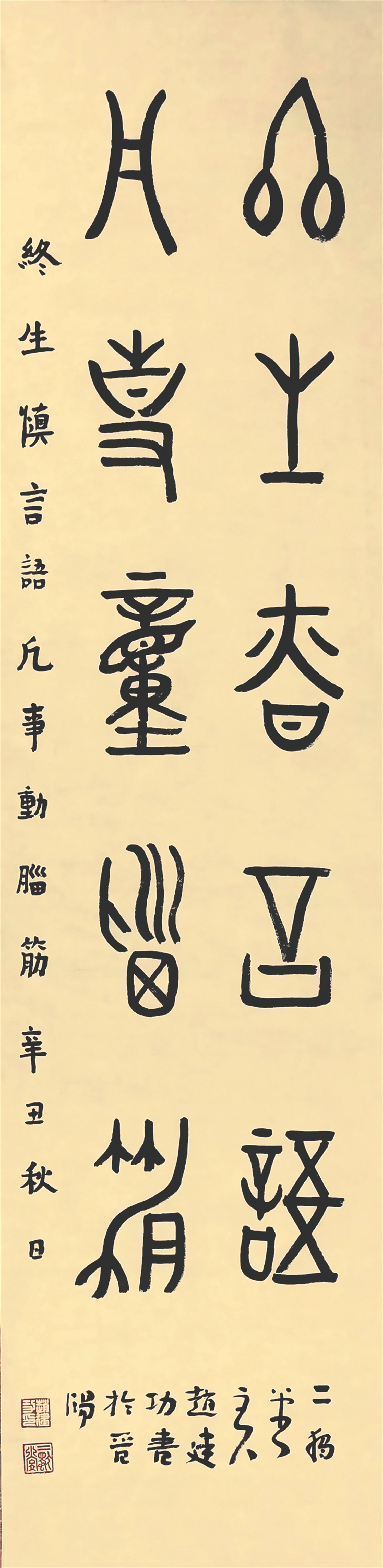 赵建功学书半个多世纪,从颜体入门,渐及“二王”、魏碑、汉隶、秦篆等。作品真、草、隶、篆诸体兼长,近年来,他又悉心钻研古文字,将小篆、金文、甲骨文诸体融会贯通,形成了二独堂的特有风格。他的榜书作品,雄健宏达;他的楷书作品,清俊多姿;他的隶书作品,沉着超迈;他的金文、篆书作品,高古典雅;他的草书作品,奔放不羁。他甚至还创造性地将汉字象形造字法运用到书法作品的创作过程中,创造性地将“画”入字,写出了许多别具一格的“书画体”作品。这些成就的取得,除了前面所述赵建功独具的“底气”和“灵气”之外,还有一个重要因素,就是他的“才气”。这个才气是后天的,即大学中文系汉语言文学专业学习对他形成的重要影响。