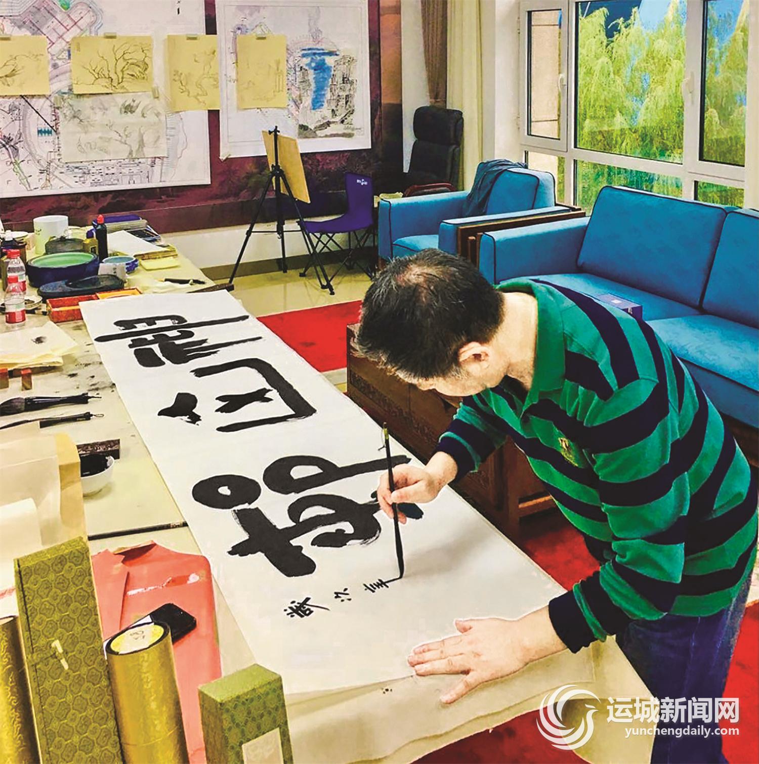我们同在一个楼层居住,我是他那里的常客。每次去都能看到他或伏案临帖,或平躺在床上读帖,十几平方米的房间里,常常摆满了墨迹未干的旧报纸、道林纸。那个时候,楷书鼻祖钟繇法帖、颜真卿《勤礼碑》《麻姑仙坛碑》,米芾《蜀素帖》、褚遂良《雁塔圣教序》、王羲之《黄庭经》《十七帖》、柳公权《玄秘塔》等,都是他潜心钻研和反复揣摩、临读的。至今,我依然记得他平躺在床上,用他那双瘦弱的手在空中写写画画的情形,那是他在用心琢磨古人碑帖拓片上的一横一竖呢。这种潜心学习古人书法精髄,汲取历代书法大家们艺术营养的习惯一直保留至今。
