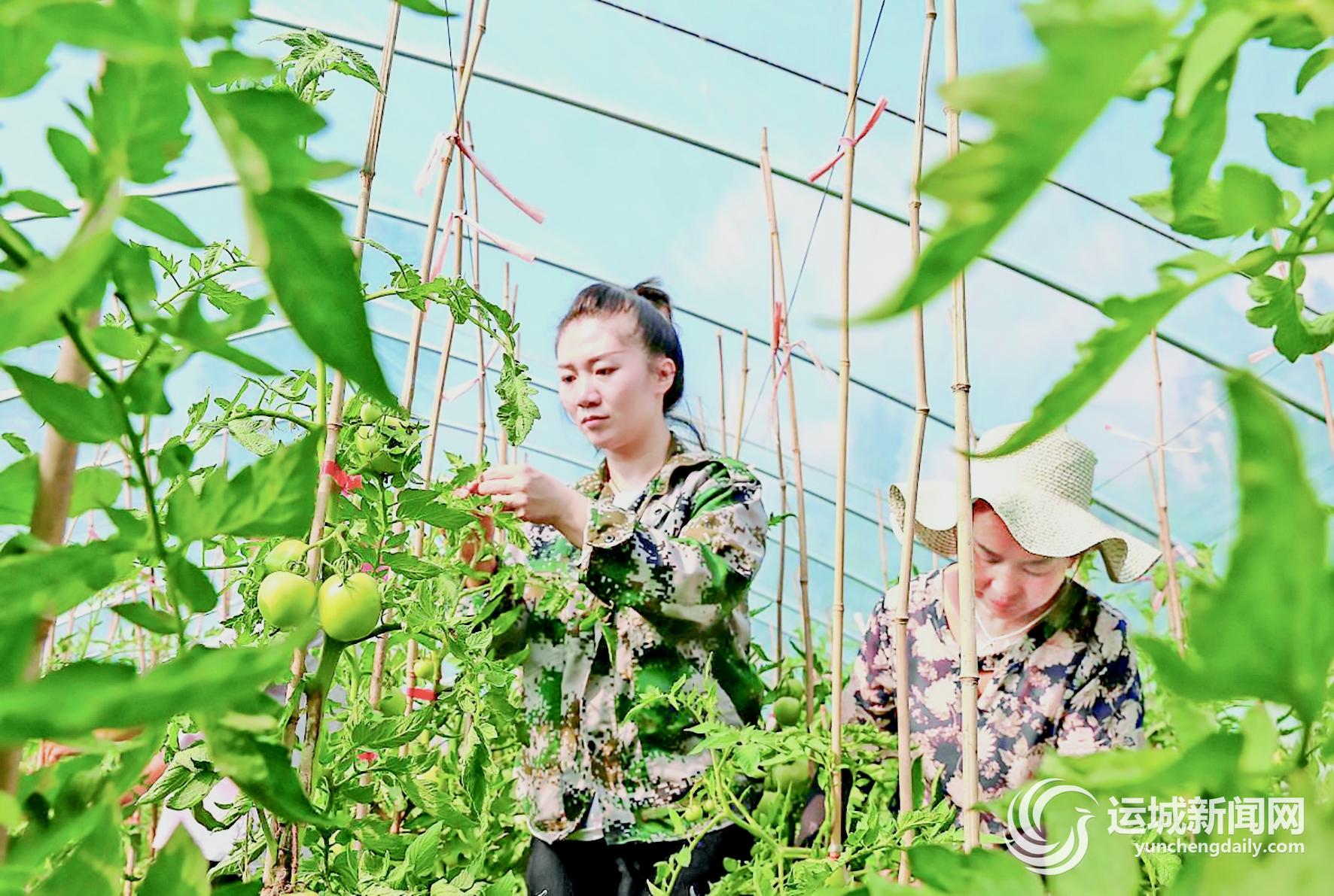 ▲7月29日,夏县泗交镇妇联主席李欣和村干部,在夏县西沟村与妇女们一起进行西红柿田间管理。