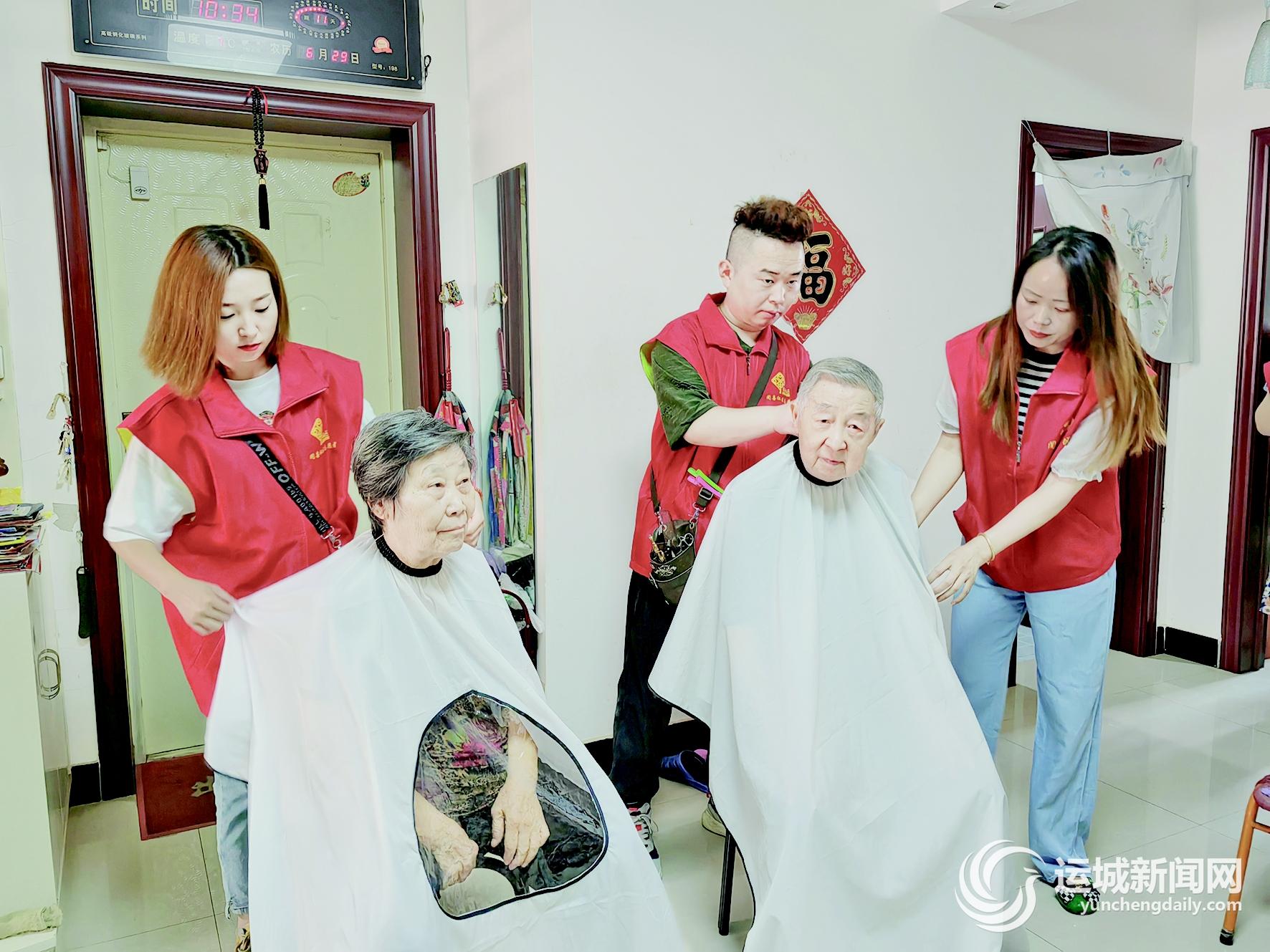 7月27日,闻喜县苗圃社区志愿者在给88岁的杨柏林老人(右)和老伴理发。