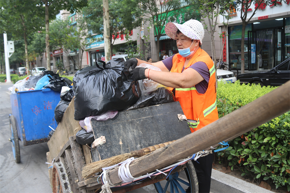 ▲7月26日,张文菊在闻喜县城公园壹号门口转运垃圾。