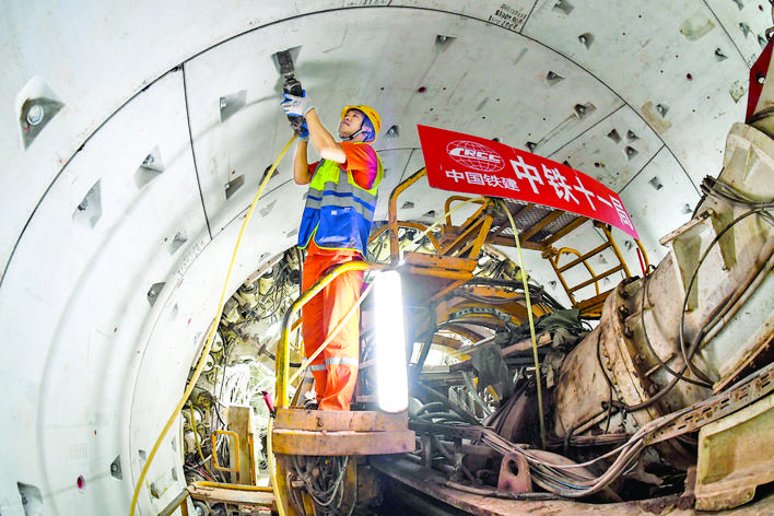 8月2日,建设者在广州地铁十号线东湖站至滨江东路站区间安装管片螺栓。 当日,中铁十一局施工的广州地铁十号线东湖站至滨江东路站区间盾构机双线安全下穿珠江航道。该区间隧道全长1260余米,下穿珠江航道600米。广州地铁十号线线路呈东北-西南走向,与多条线路形成换乘。 新华社记者 刘大伟 摄