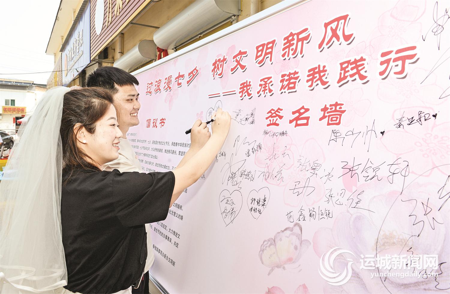 ▲8月4日,一对新人在万荣县民政局精心设计和准备的签名墙上签名。 当日,成双成对的青年人相约登记结婚。新人们身穿喜庆服饰,手捧鲜花,走进甜蜜生活,营造了特有的“七夕”浪漫氛围。 截至上午12时,该局婚姻登记处共为42对新人颁发了结婚证书。 特约摄影 王成林 摄