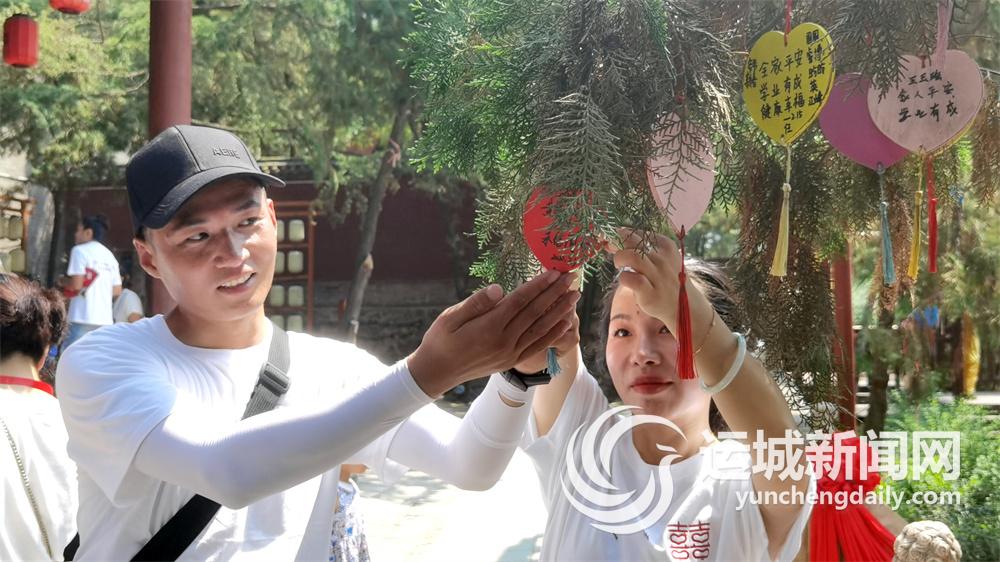 ▲8月4日,一对情侣在参加完山西永济第24届爱情文化节大型唐制旅游集体婚礼后,登上普救寺,把“永结同心”挂在了许愿树上。 董应赞 摄