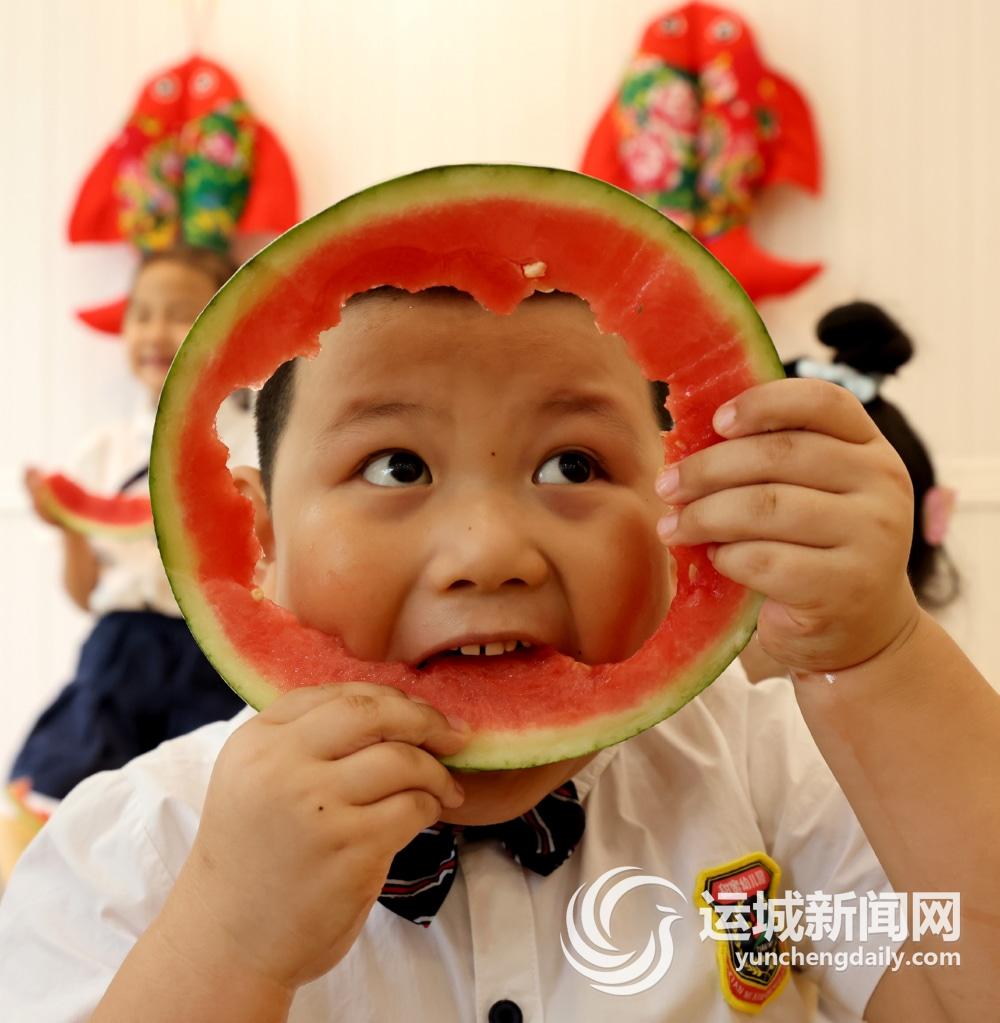 8月6日,山东省枣庄市龙山路街道一家幼儿园小朋友在吃西瓜“啃秋”。