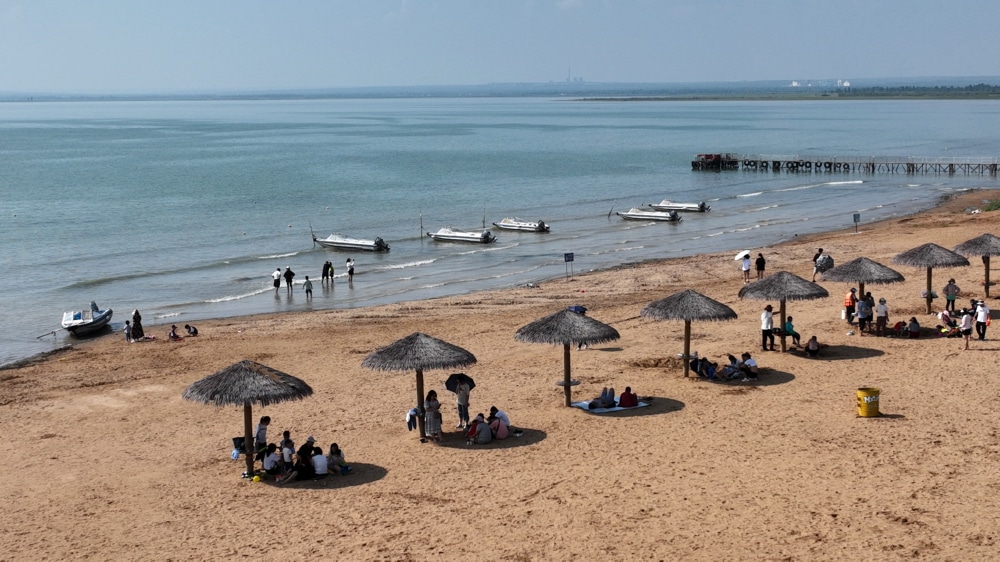 近日,游人在红碱淖景区休闲(无人机照片)。