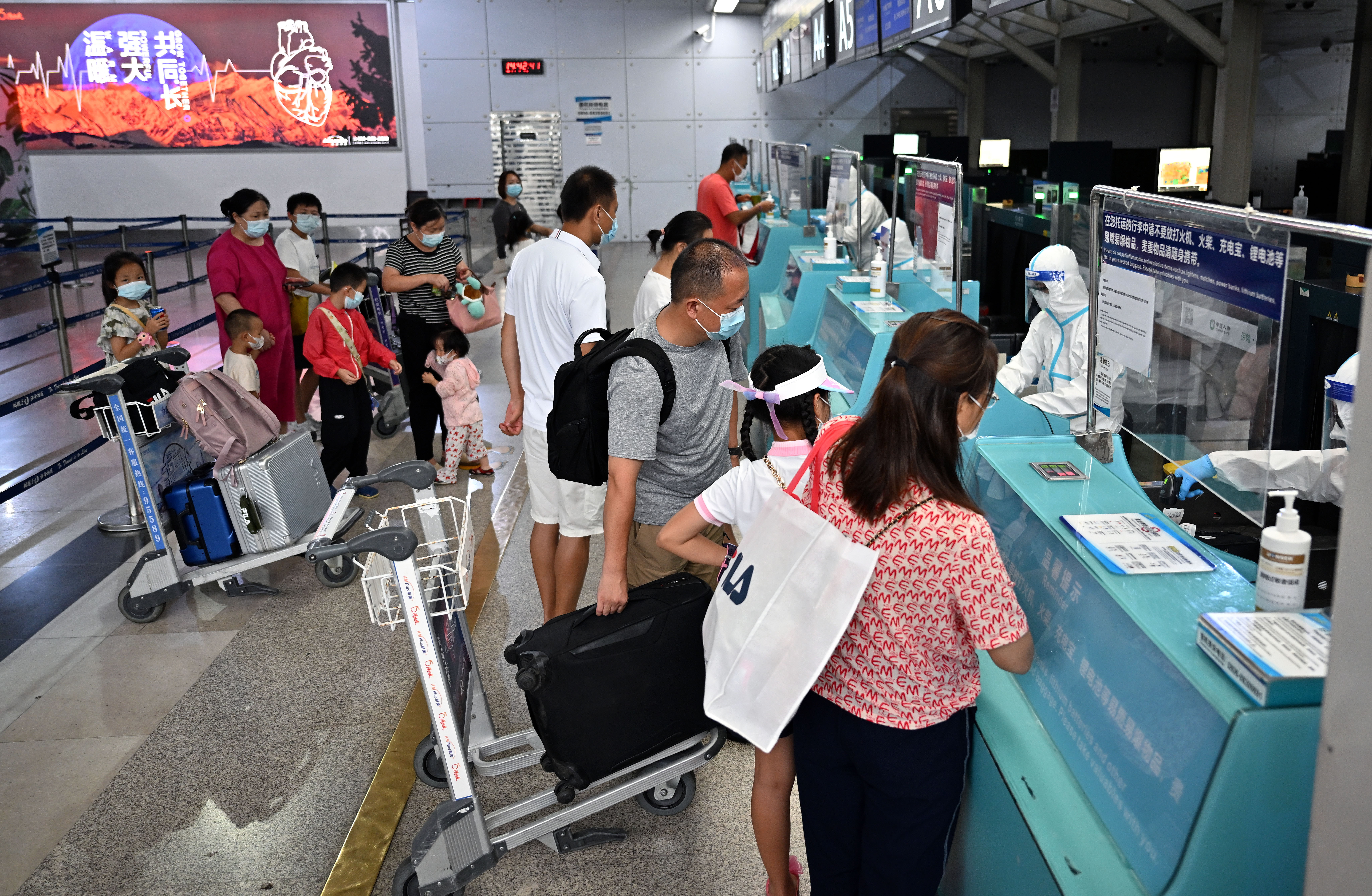 8月9日,滞留海南三亚的游客在三亚凤凰国际机场办理登机手续。 当日,首批125名滞留三亚的游客搭乘飞机前往西安。